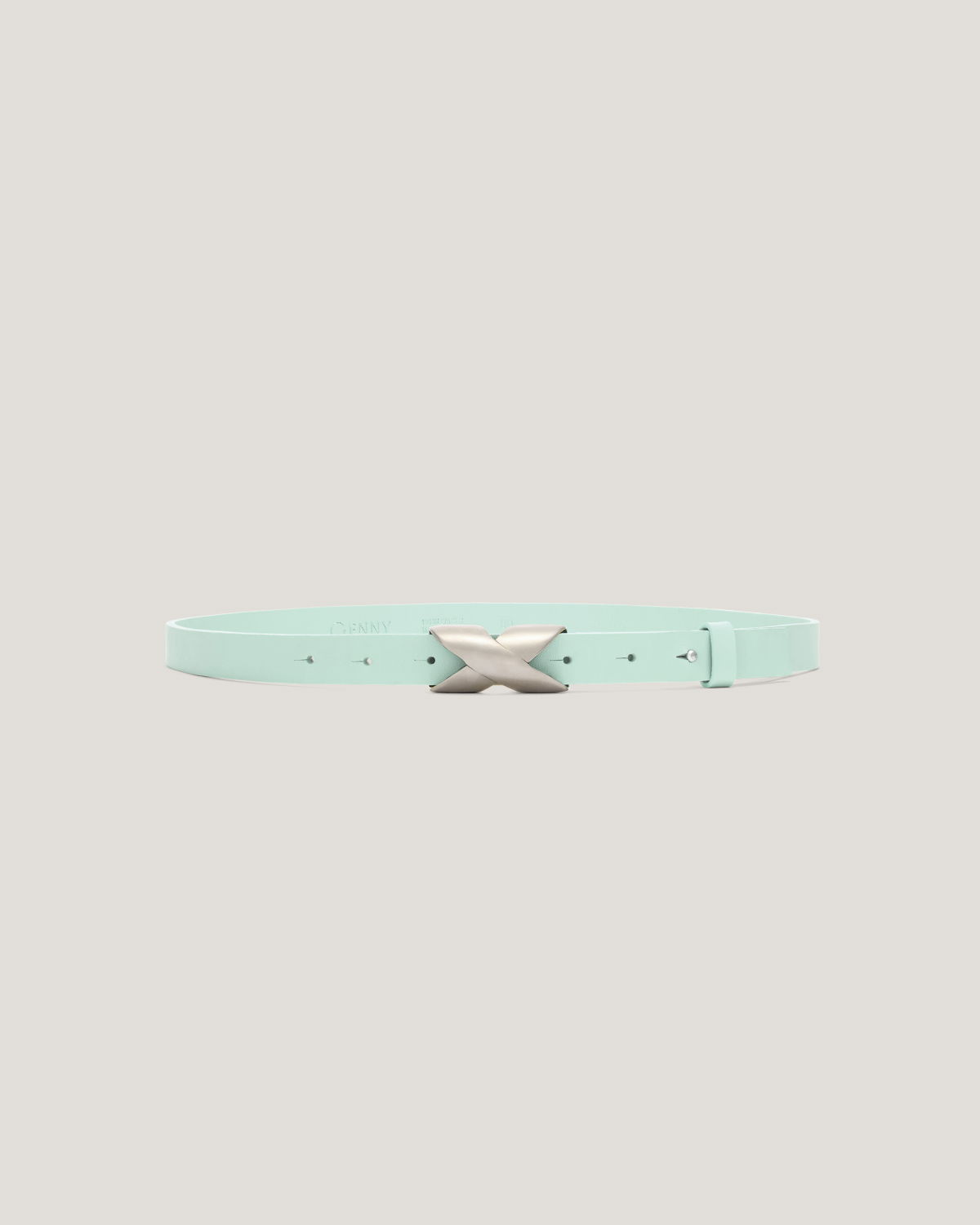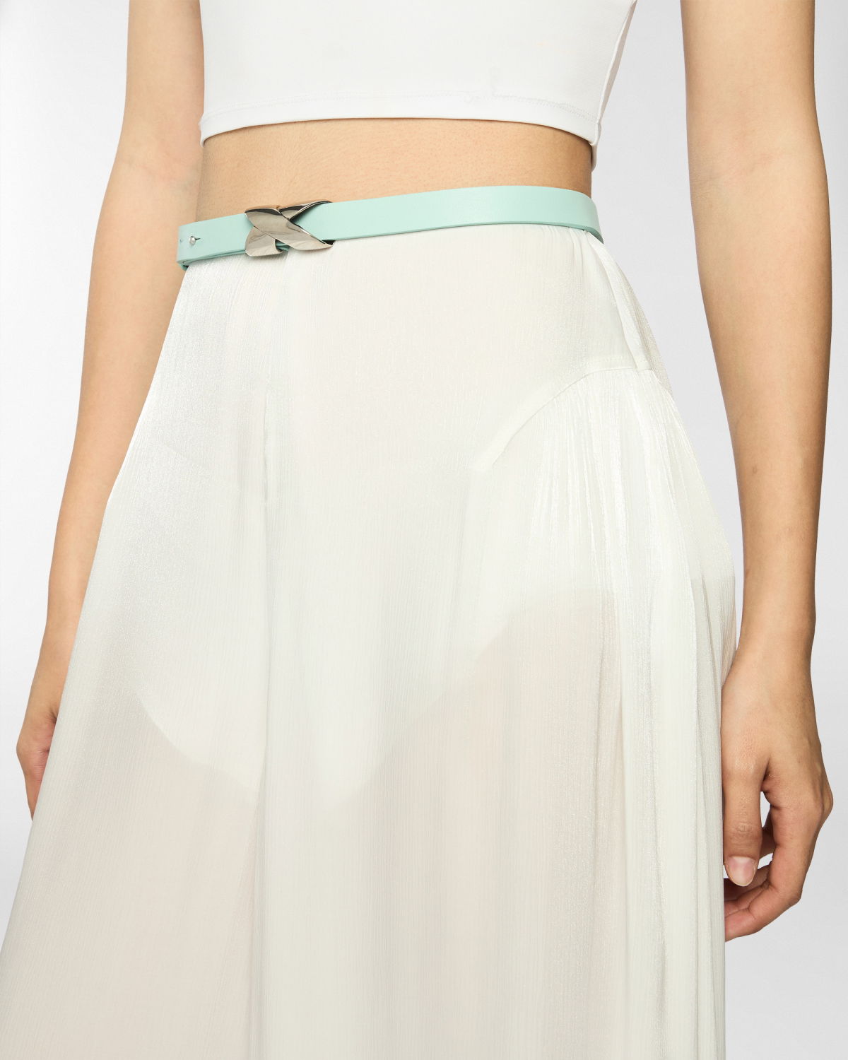 Slim belt, featuring a silver wave-shaped buckle. A modern and minimalist accessory, ideal for enhancing any outfit with understated elegance.