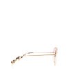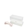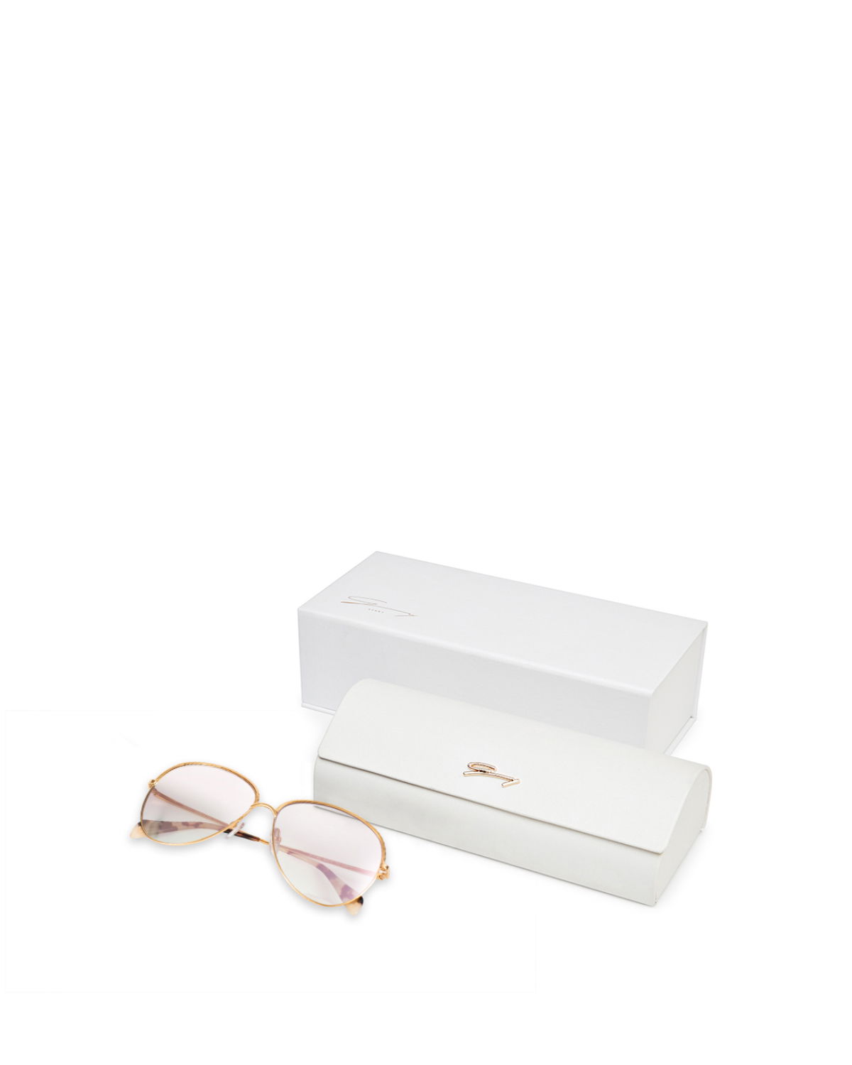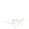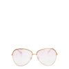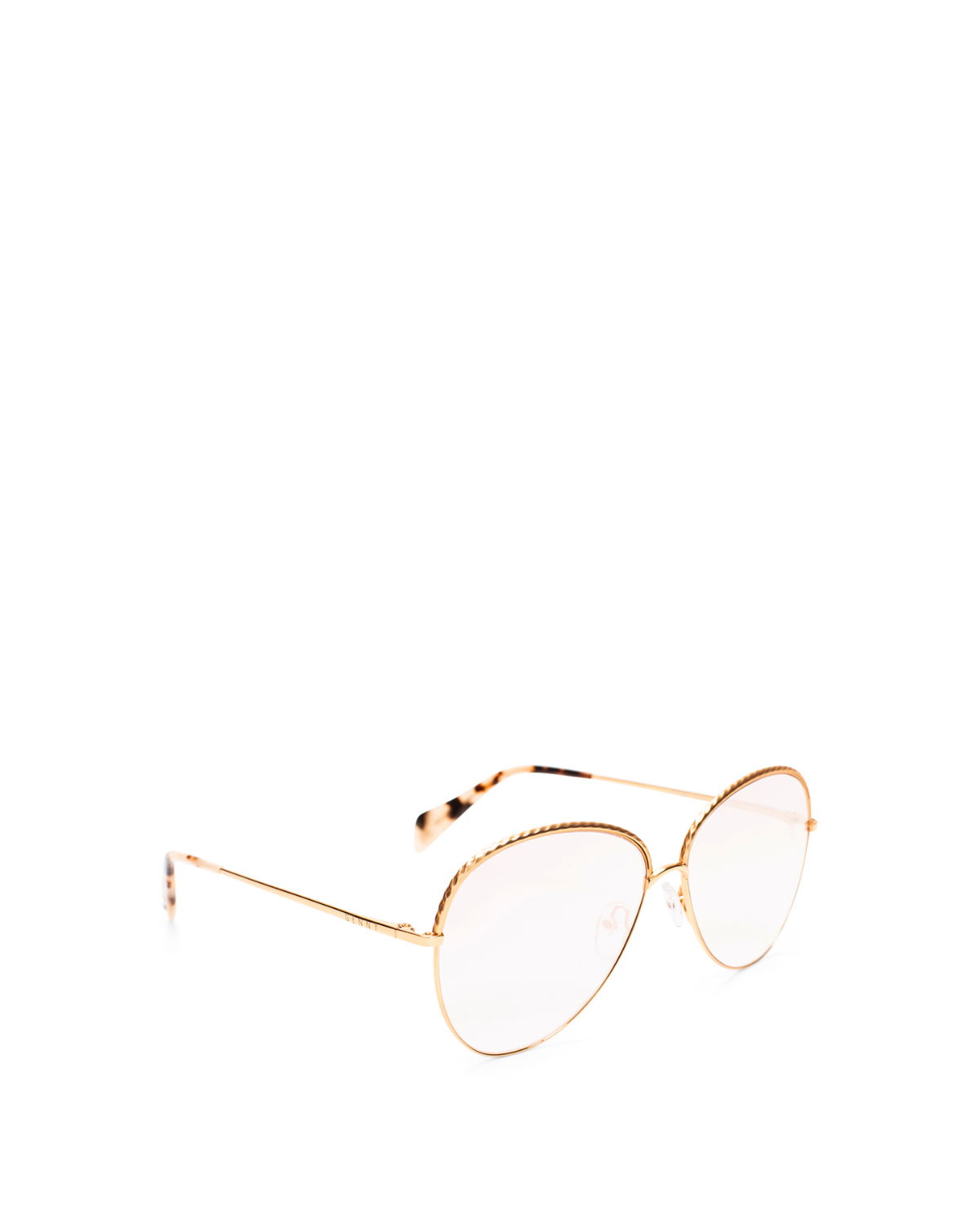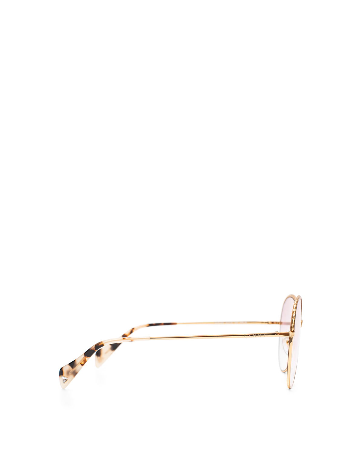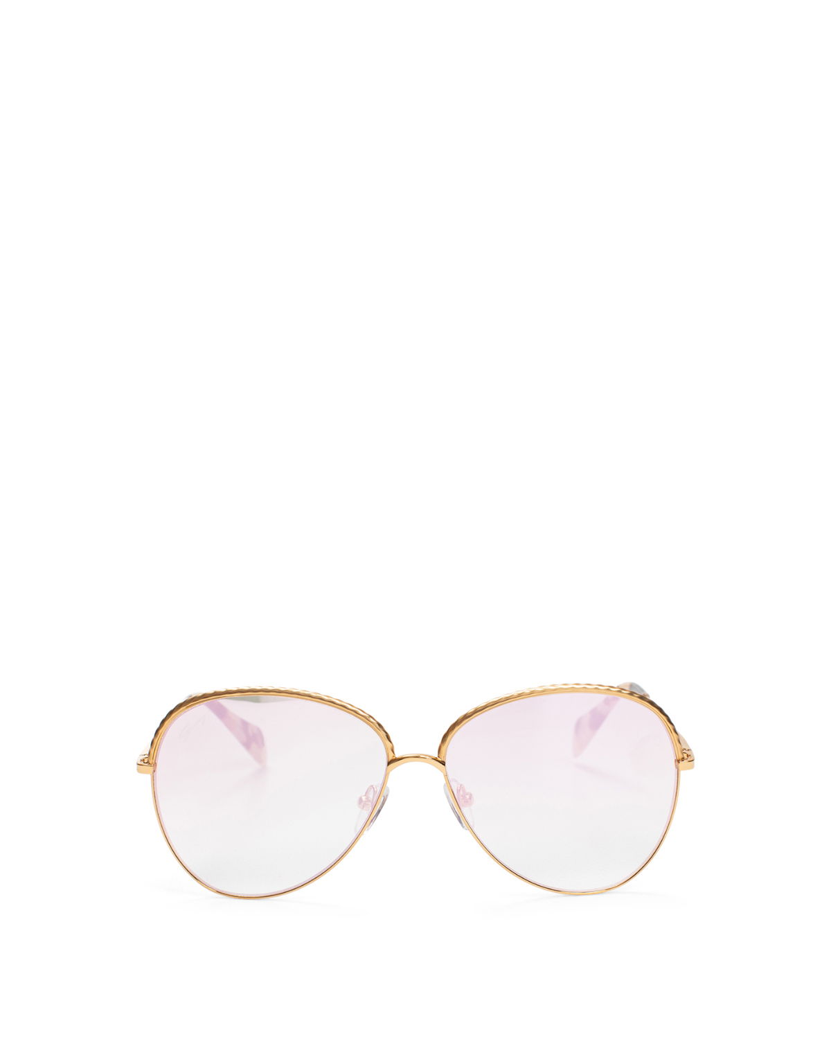 The gold braided round-frame sunglasses are embelished around the lenses with a golden ring. The lenses are in a gradient pink shade.