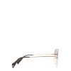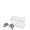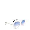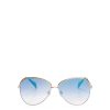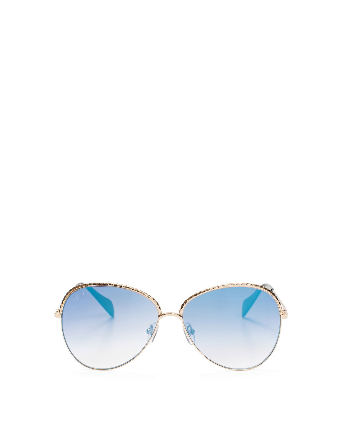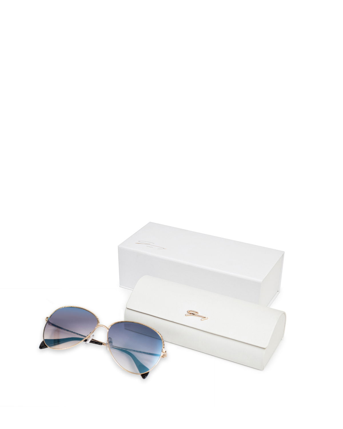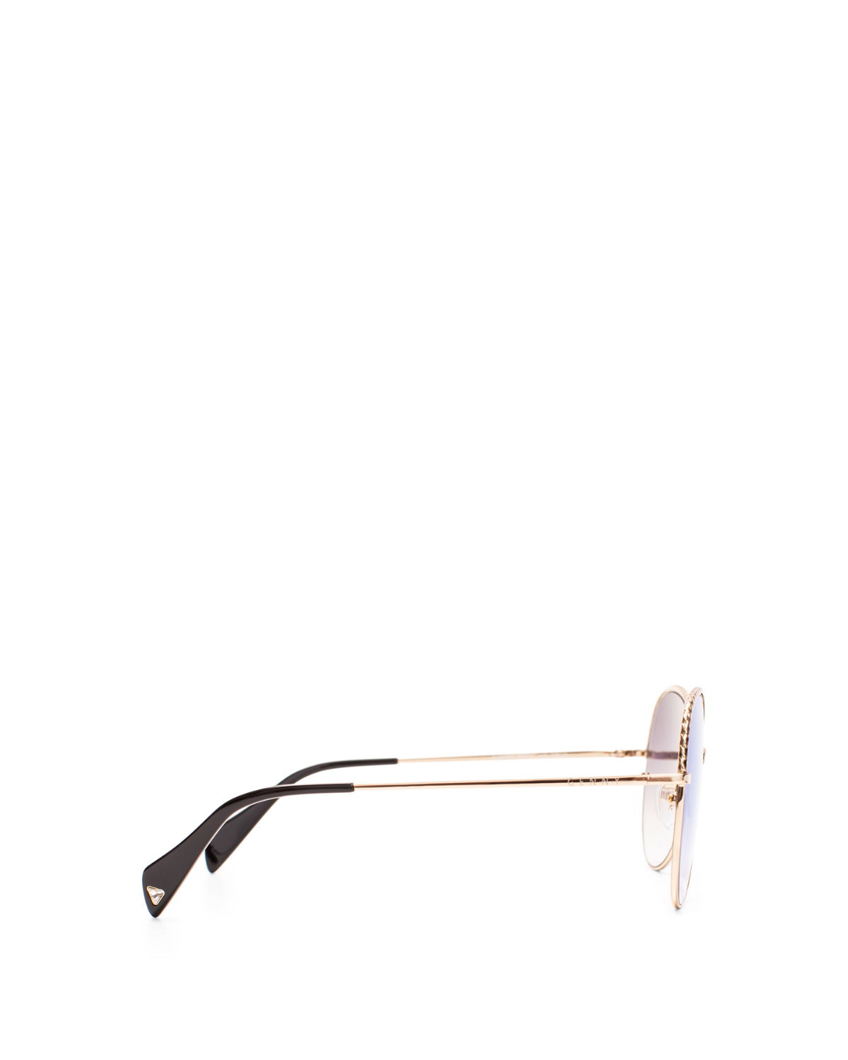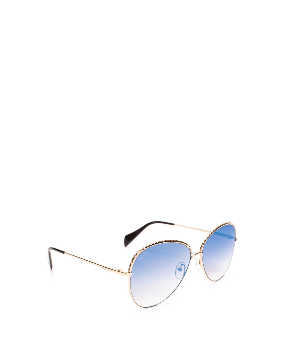 The gold braided round-frame sunglasses are embelished around the lenses with a golden ring. The lenses are in a gradient light blue shade.