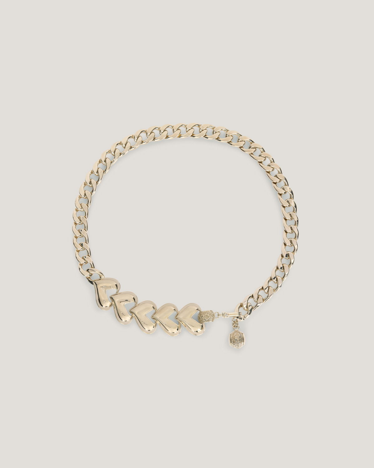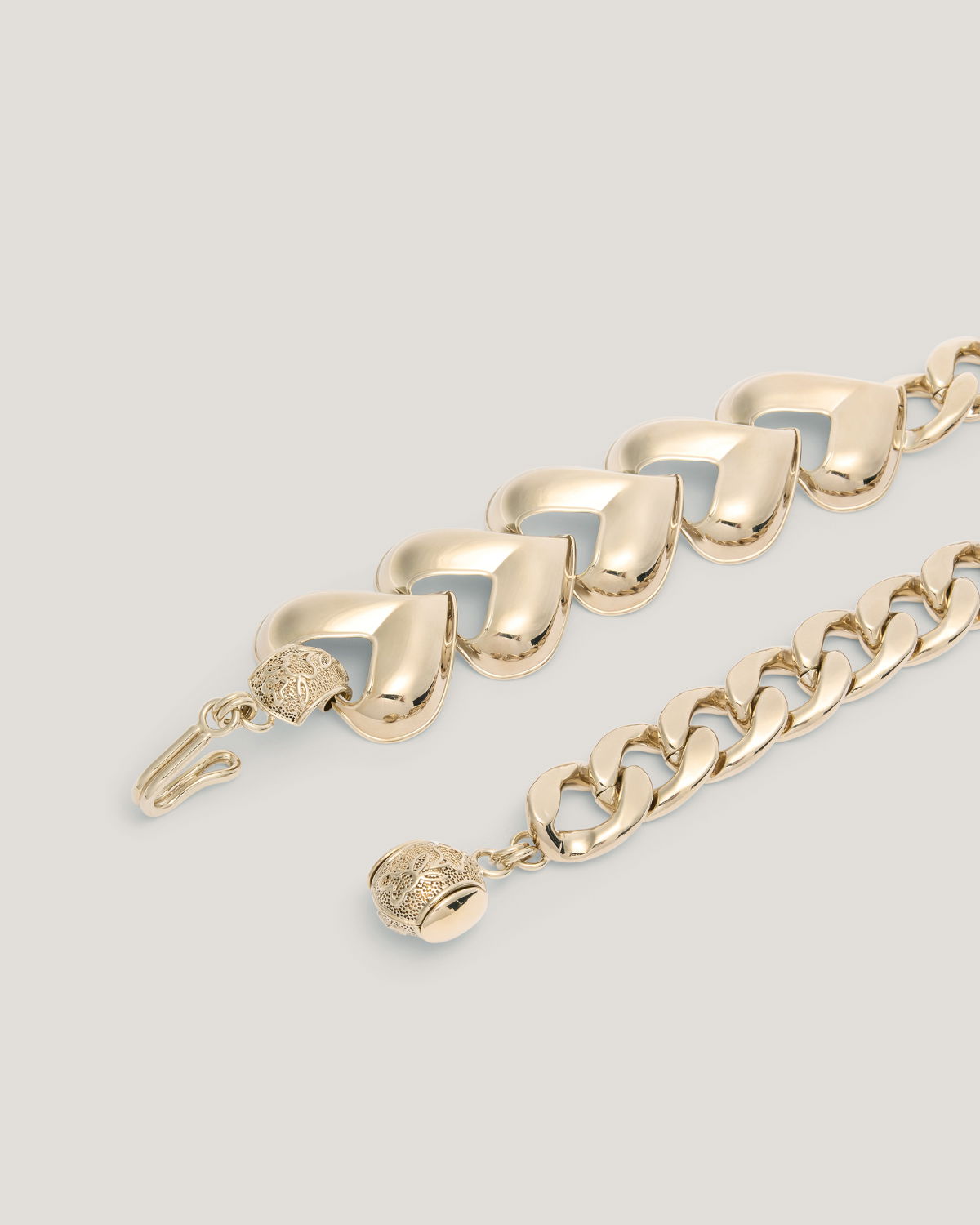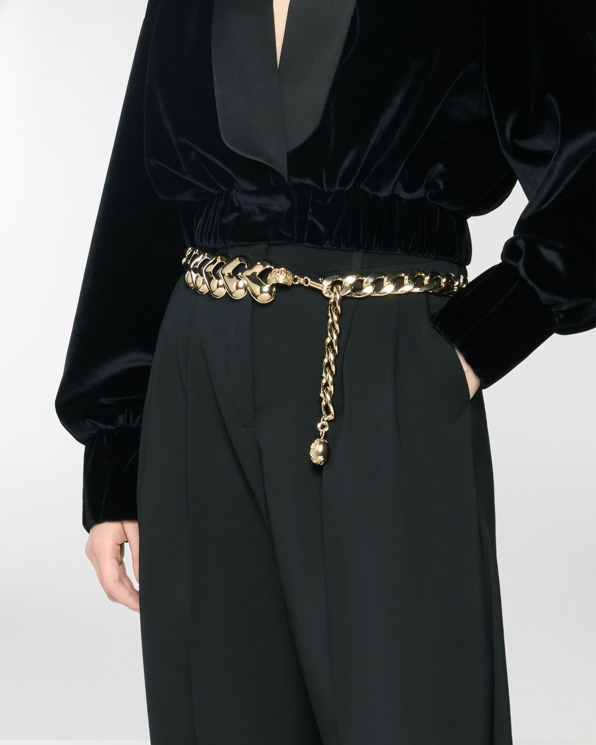 An iconic accessory that enhances femininity with a luminous touch. Crafted from gold-tone metal, this belt features a bold chain design adorned with sculpted heart charms — a romantic and distinctive detail.
