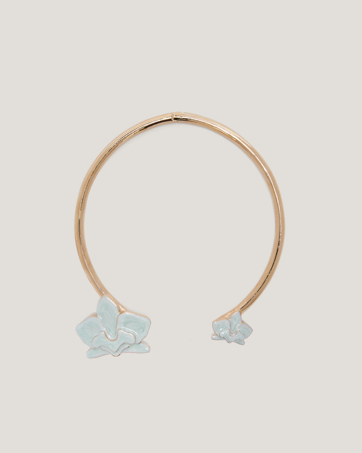 This elegant necklace is adorned with delicate orchids at both ends, crafted in polished brass that beautifully reflects the light. The minimalist design adds a touch of sophistication to any look, while the subtle floral detail brings a unique and feminine touch. The open-ended structure makes it easy to wear and style, perfect for both day and evening looks.