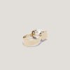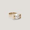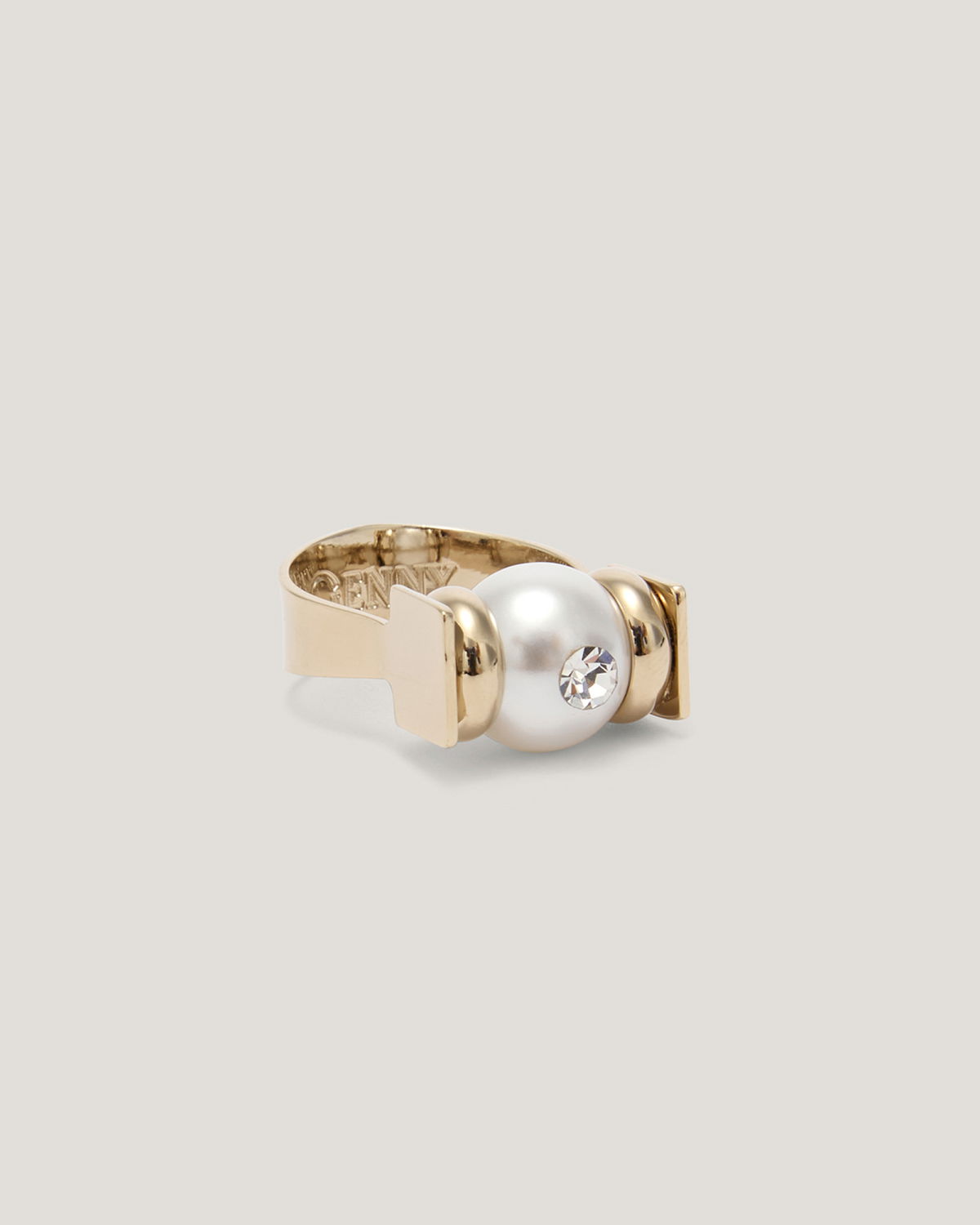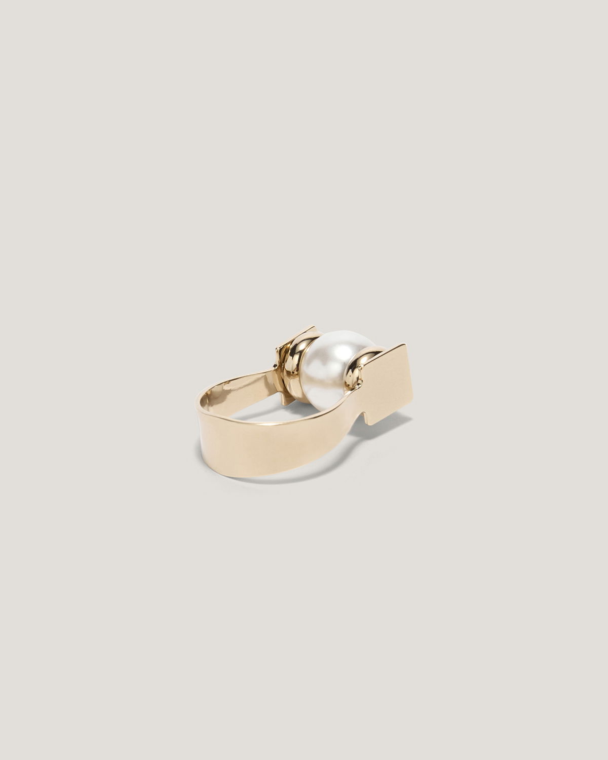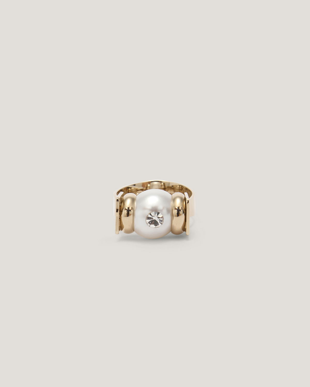 Gold-tone metal ring with a contemporary design, featuring a central pearl embellished with a sparkling rhinestone detail. The clean geometry and balance between minimal lines and decorative accents make this jewel a refined statement accessory, perfect to elevate both elegant and modern looks.