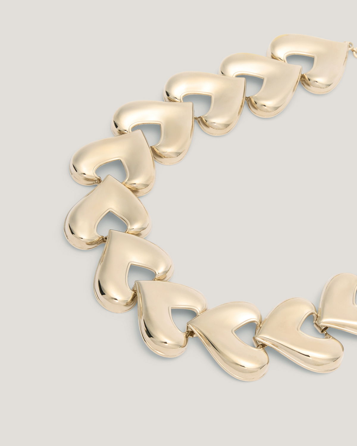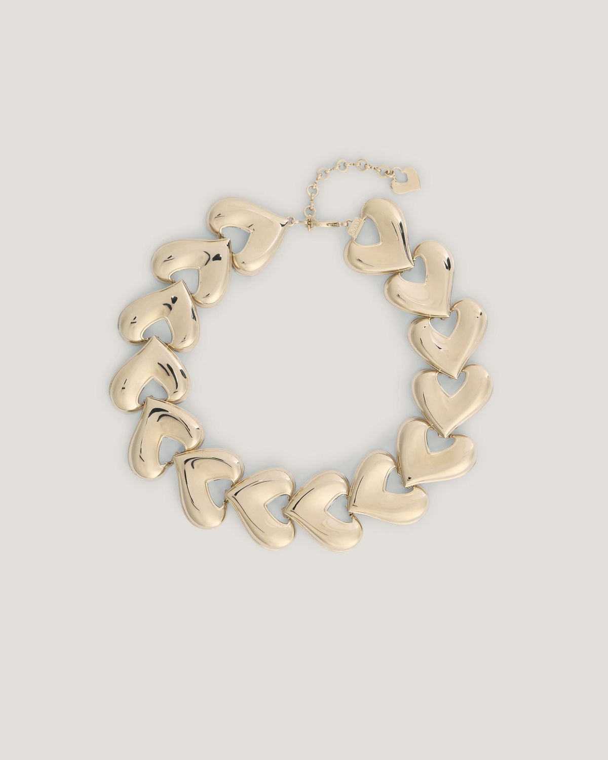 A bold and contemporary design defines this structured collar necklace, crafted from a sequence of sculptural gold-tone hearts. The fluid, glossy shapes create a harmonious rhythm that gracefully frames the neckline with elegance and character. A statement jewel, ideal for elevating any evening ensemble with confident allure.