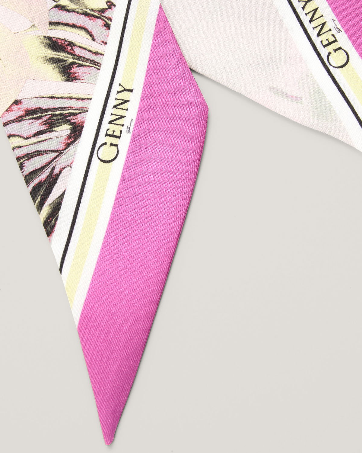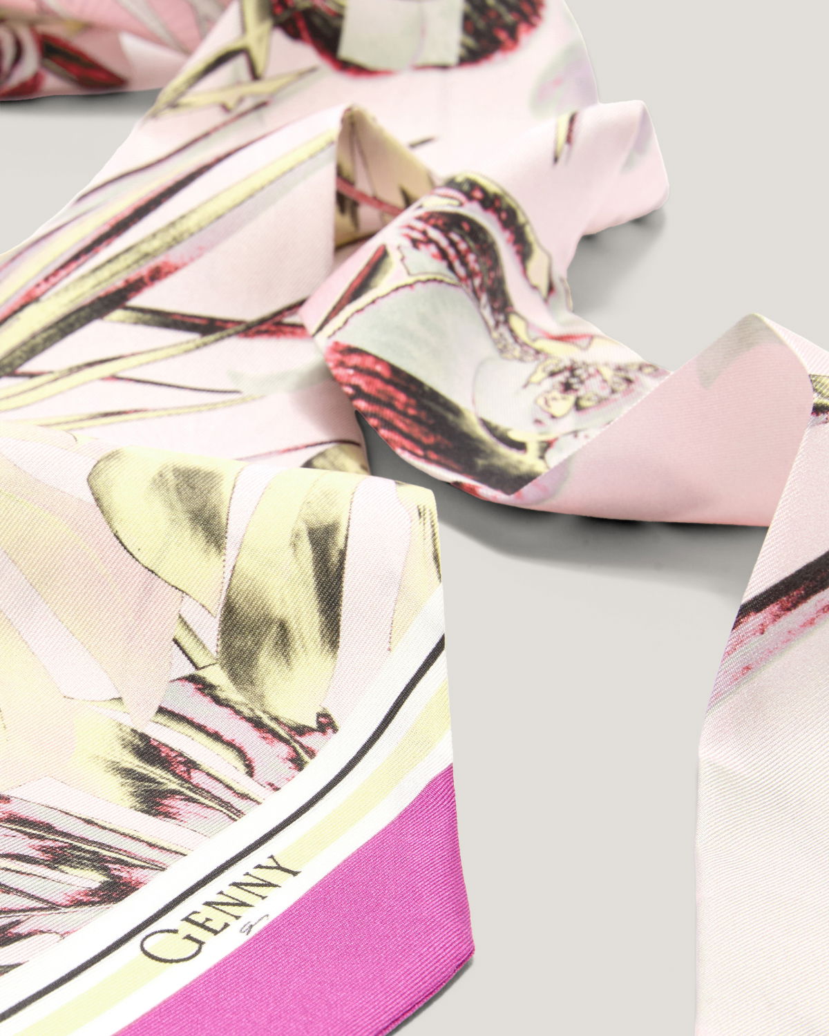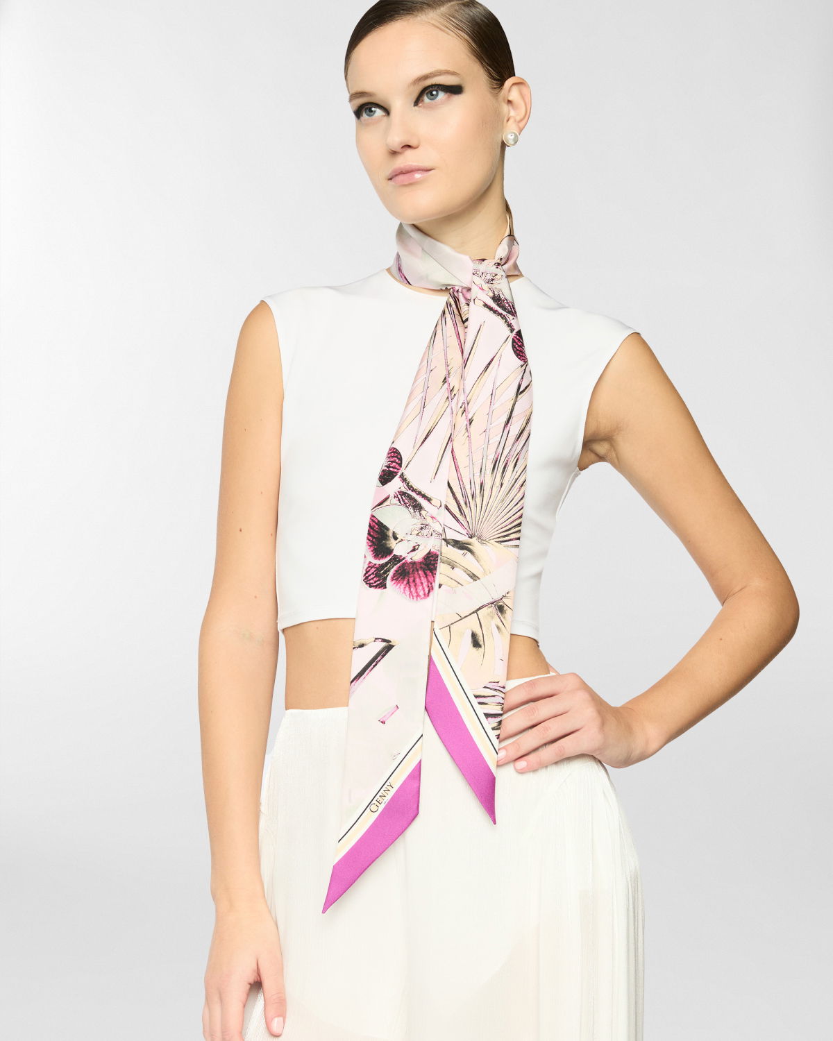 Elegant scarf crafted from pure silk, featuring a Jungle Orchids print with natural and floral motifs. The soft and fluid texture of the fabric provides a delicate drape, perfect for enhancing any outfit with a touch of femininity and elegance. The tapered ends give it a modern and versatile look, ideal for wearing around the neck or tied to a bag for a chic and sophisticated detail.