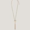 A sensuous long necklace featuring a polished gold-tone heart pendant, adorned with radiant details and a tassel made of fine chain strands. Its elongated silhouette and luminous finish make it the perfect accessory to elevate eveningwear or refined, modern ensembles.