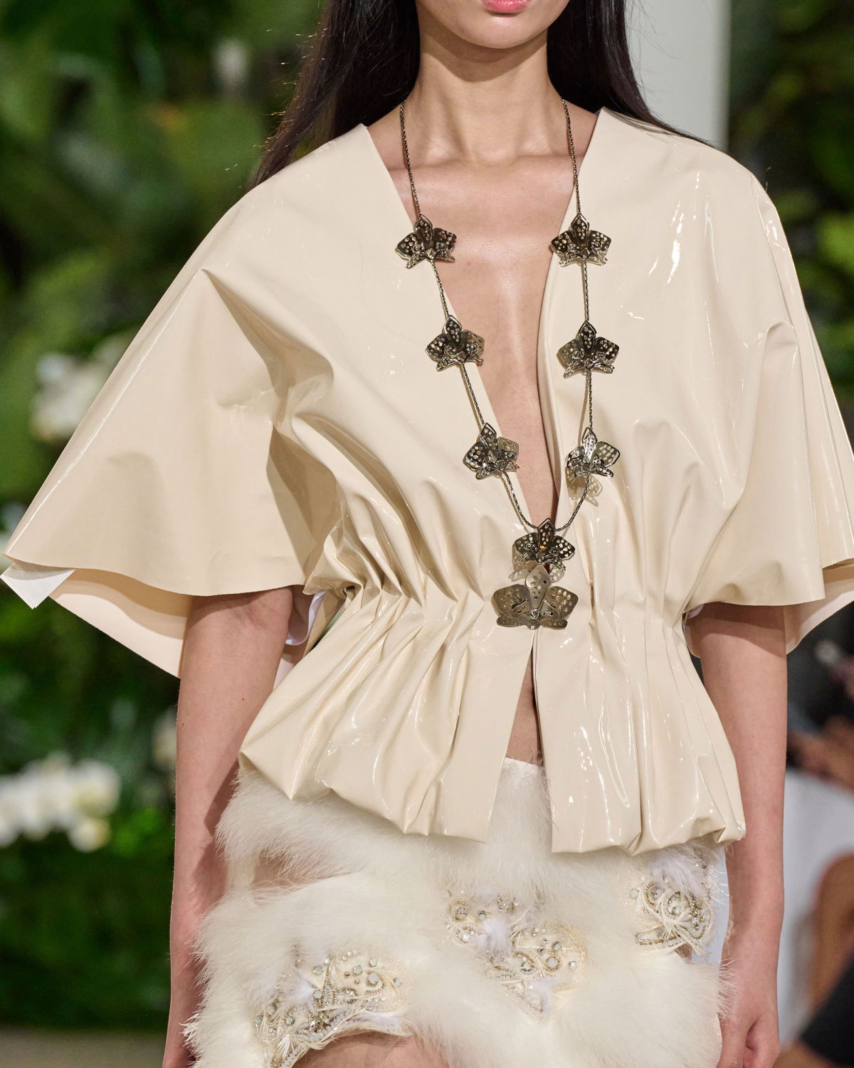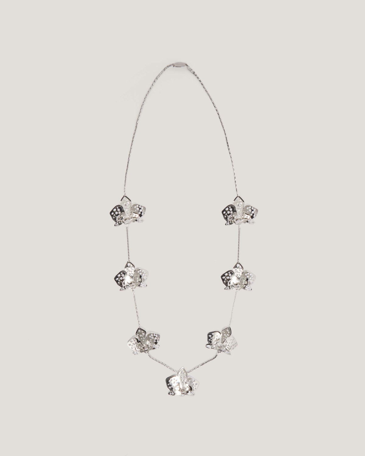 The elegant necklace with perforated orchids is a long piece composed of three intricate layers, each adorned with refined details and an irresistible three-dimensional effect.