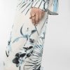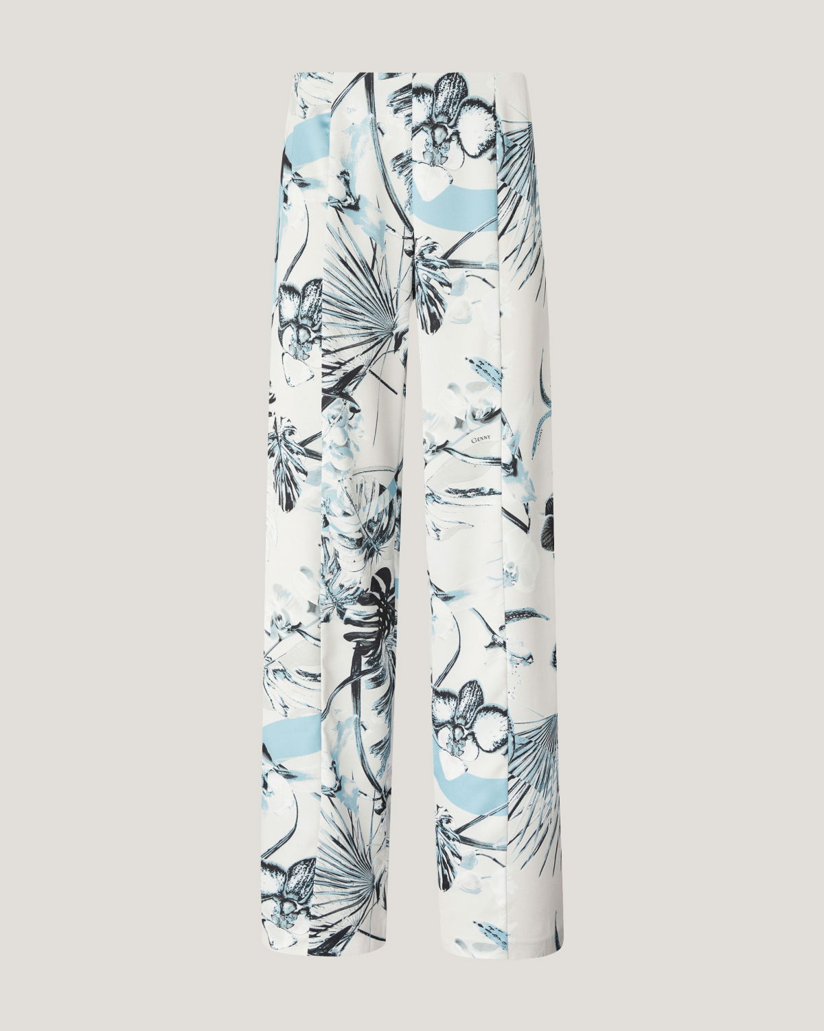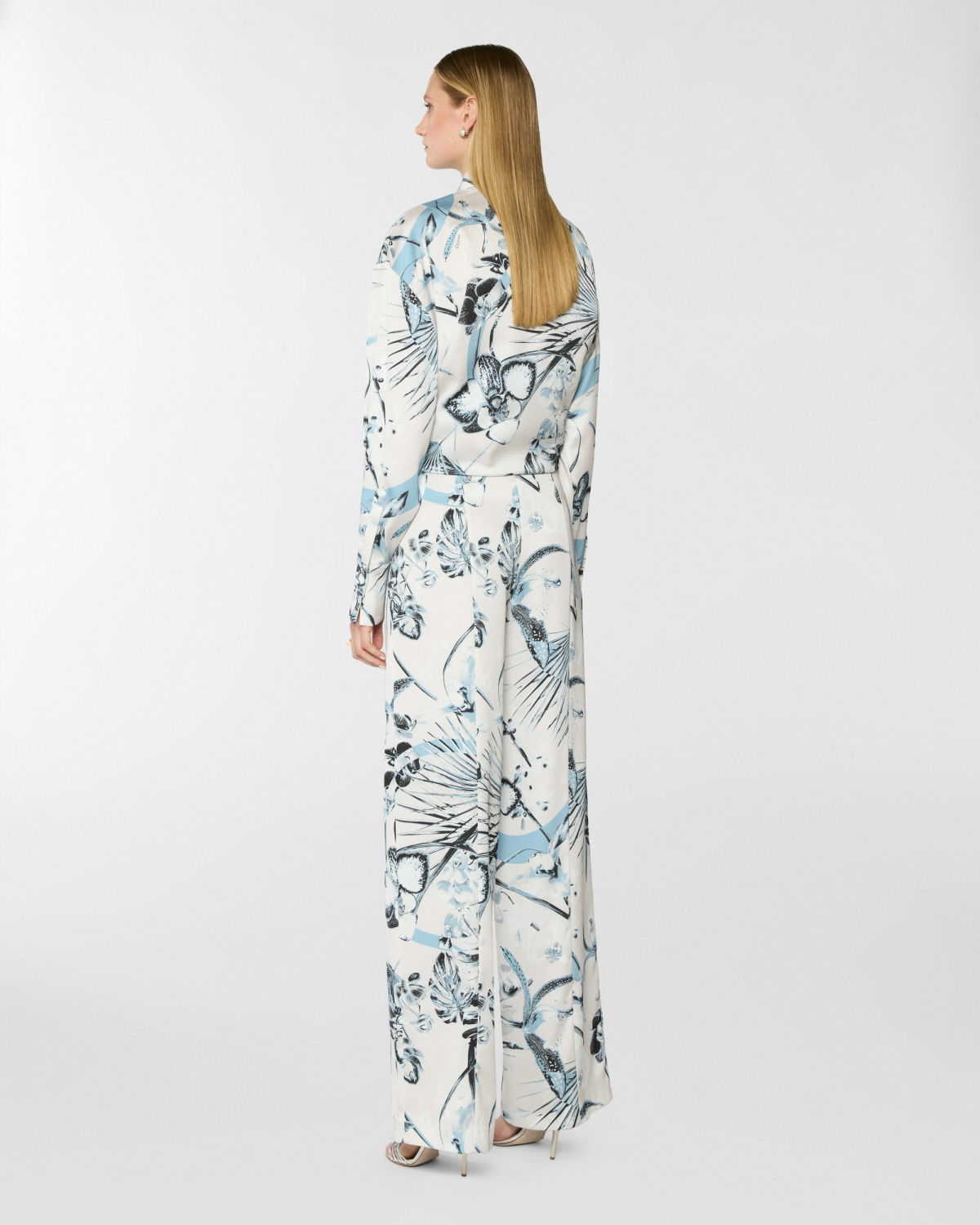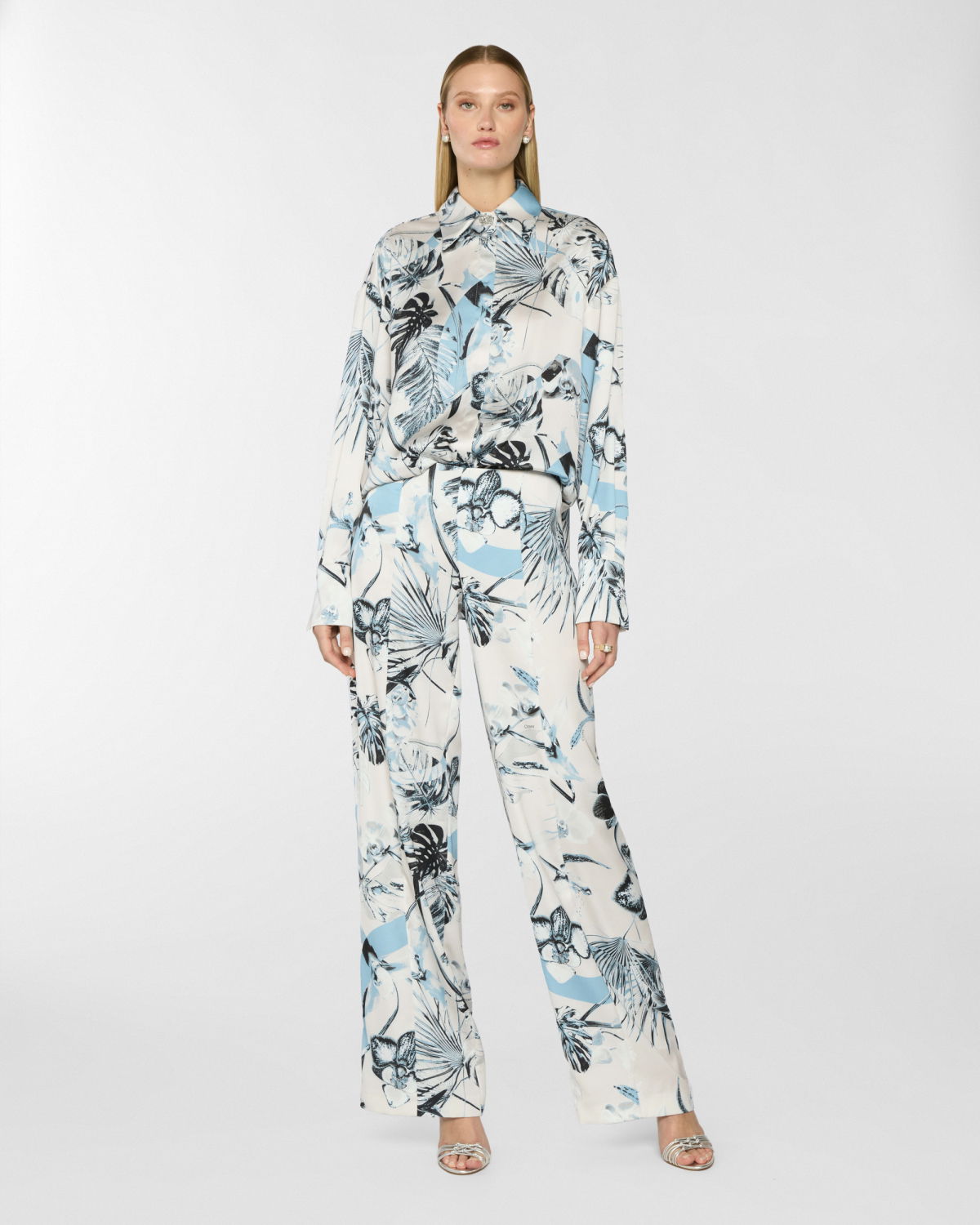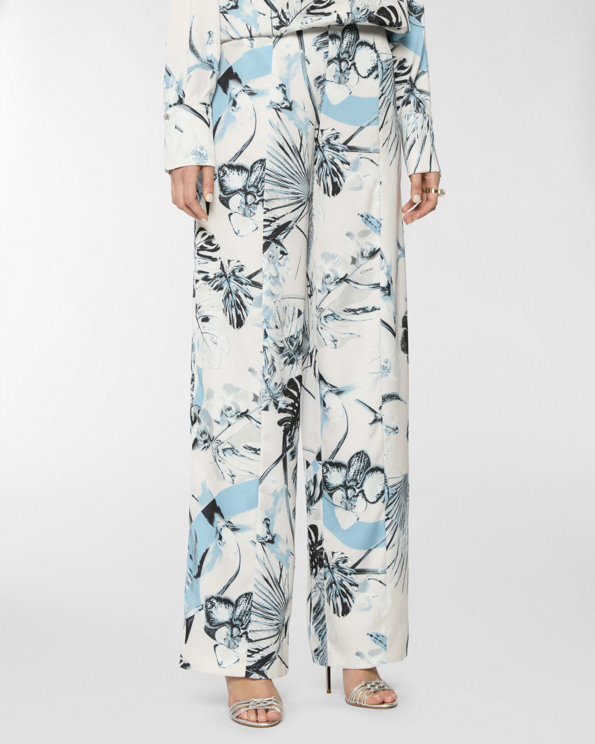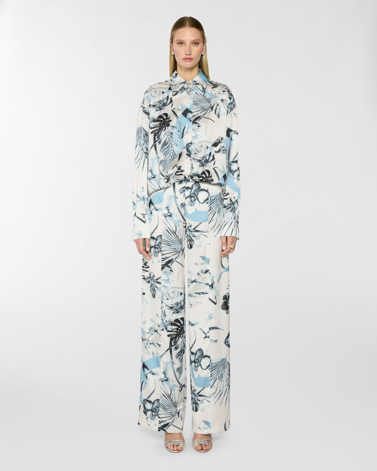 These long palazzo pants in Anversa Jungle print feature a lustrous finish. The fluid leg is enhanced by a central seam that elongates the silhouette. Designed with a low-rise waist and no waistband, they are finished with a discreet side zipper.