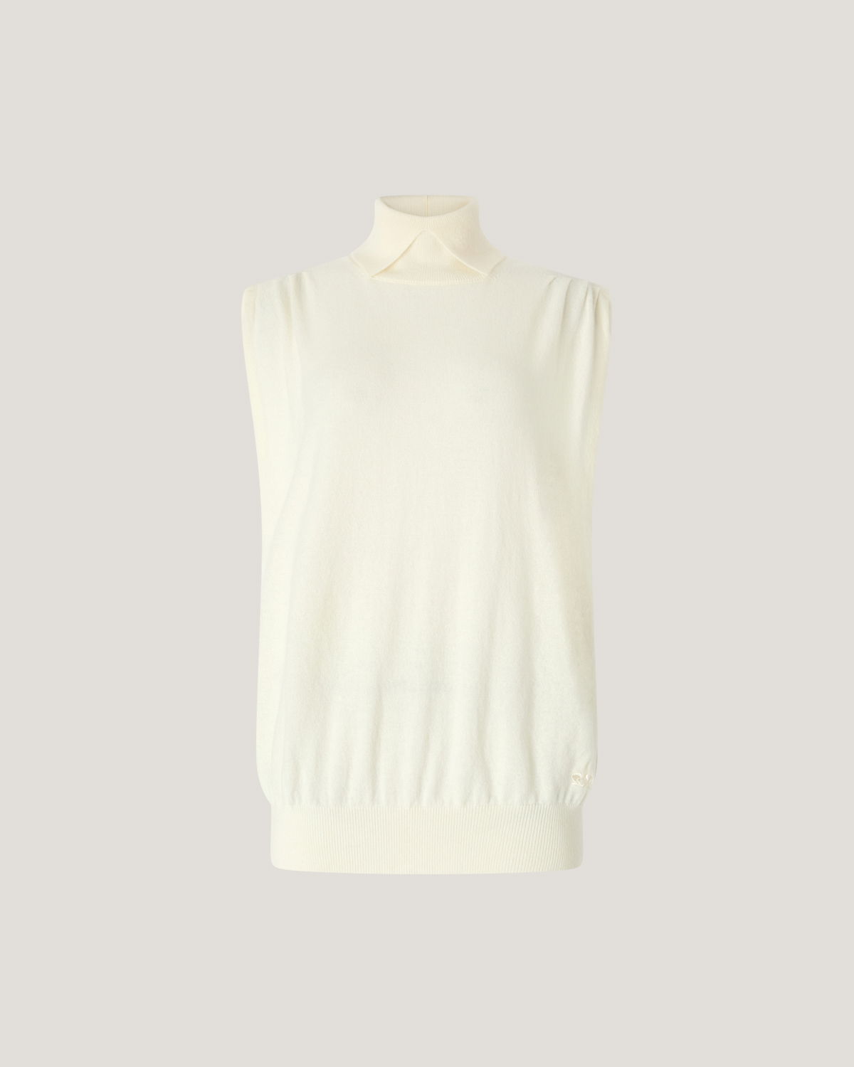 This sleeveless top is crafted from ultra-fine cashmere with a featherlight, ethereal texture. The open-front turtleneck and subtle gathers at the shoulders add volume and delicacy. With its fluid fit and hip-length cut, it’s ideal worn alone or layered under a blazer for a refined touch. An orchid embroidery in a matching tone is featured on the back.