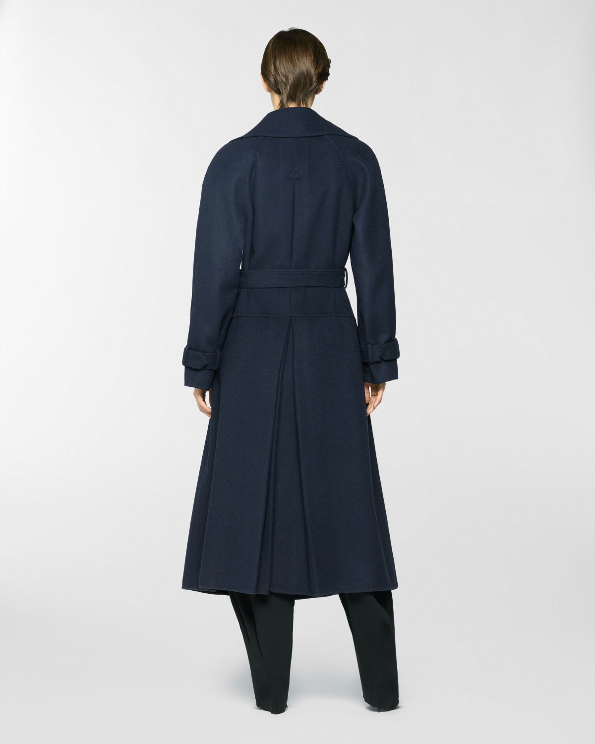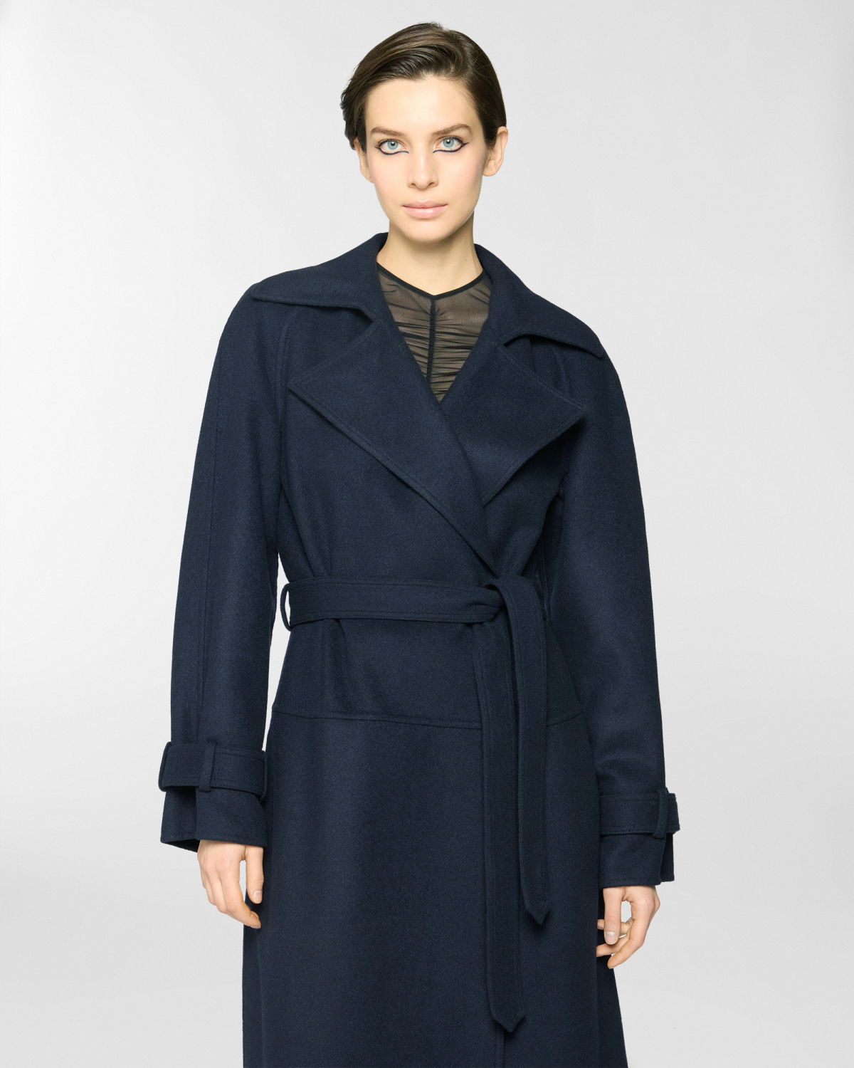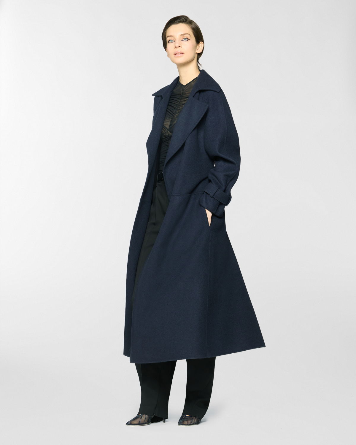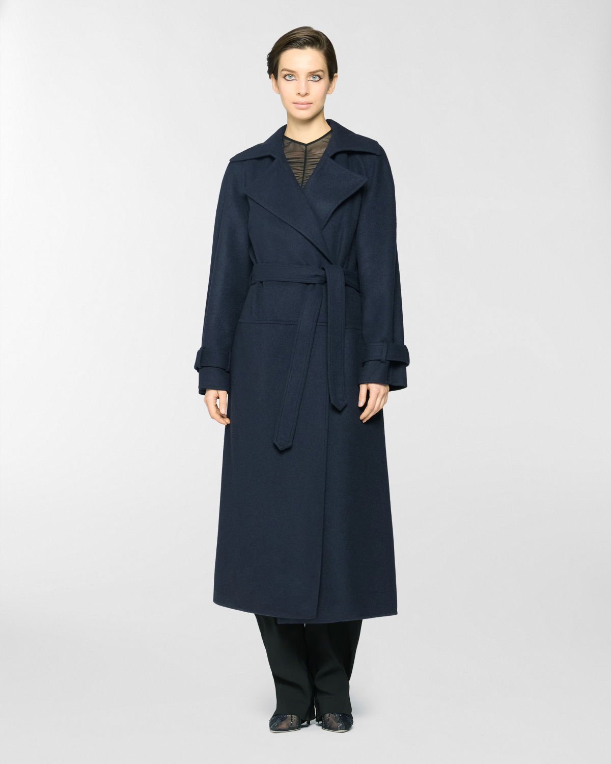 Long trench coat featuring an elegant waist belt and tailored details such as strap cuffs. The silhouette is fluid, with classic lapels and softly structured sleeves. Made from a wool and cashmere blend, it boasts a velvety texture that offers both structure and comfort. Perfect for completing cold-season looks with effortless elegance.