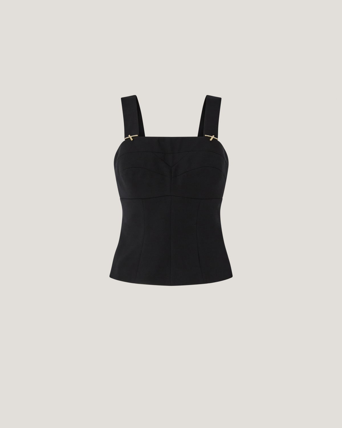 This bustier top features a squared neckline and straps embellished with iconic “X”-shaped rhinestone accents. The cut-out detailing on the cups creates a delicate play of construction that enhances the décolleté with subtle elegance. The fitted silhouette highlights the waistline.