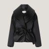 Short super-stretch satin jacket, featuring a wide shawl collar and an oversized silhouette with modern comfort. The waist belt enhances the figure, striking a balance between softness and structure. With long sleeves and a hip-length cut, it’s perfect for both everyday looks and refined evening outfits.