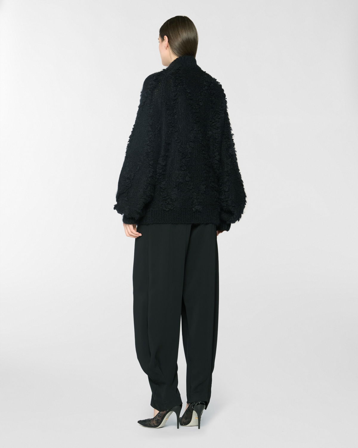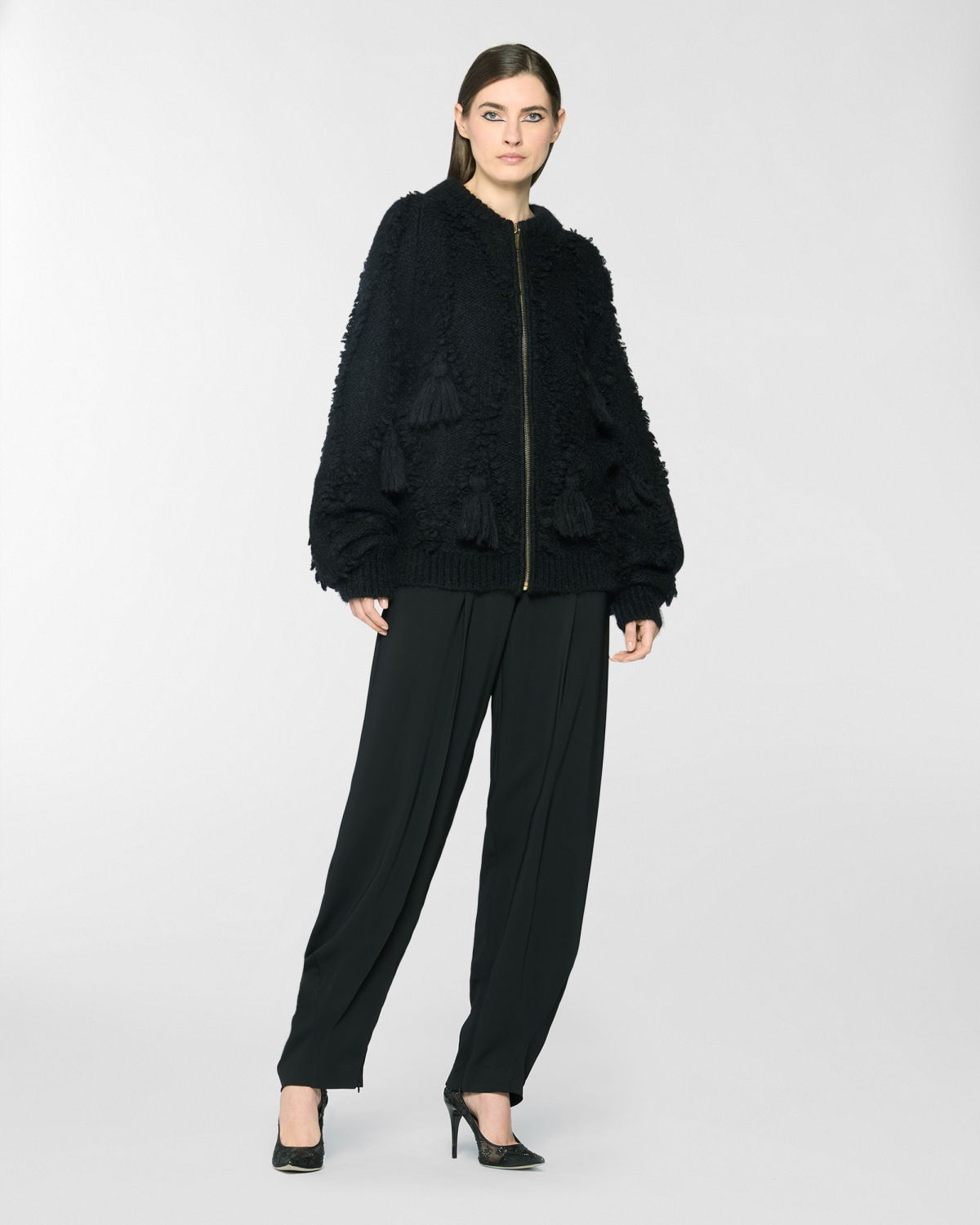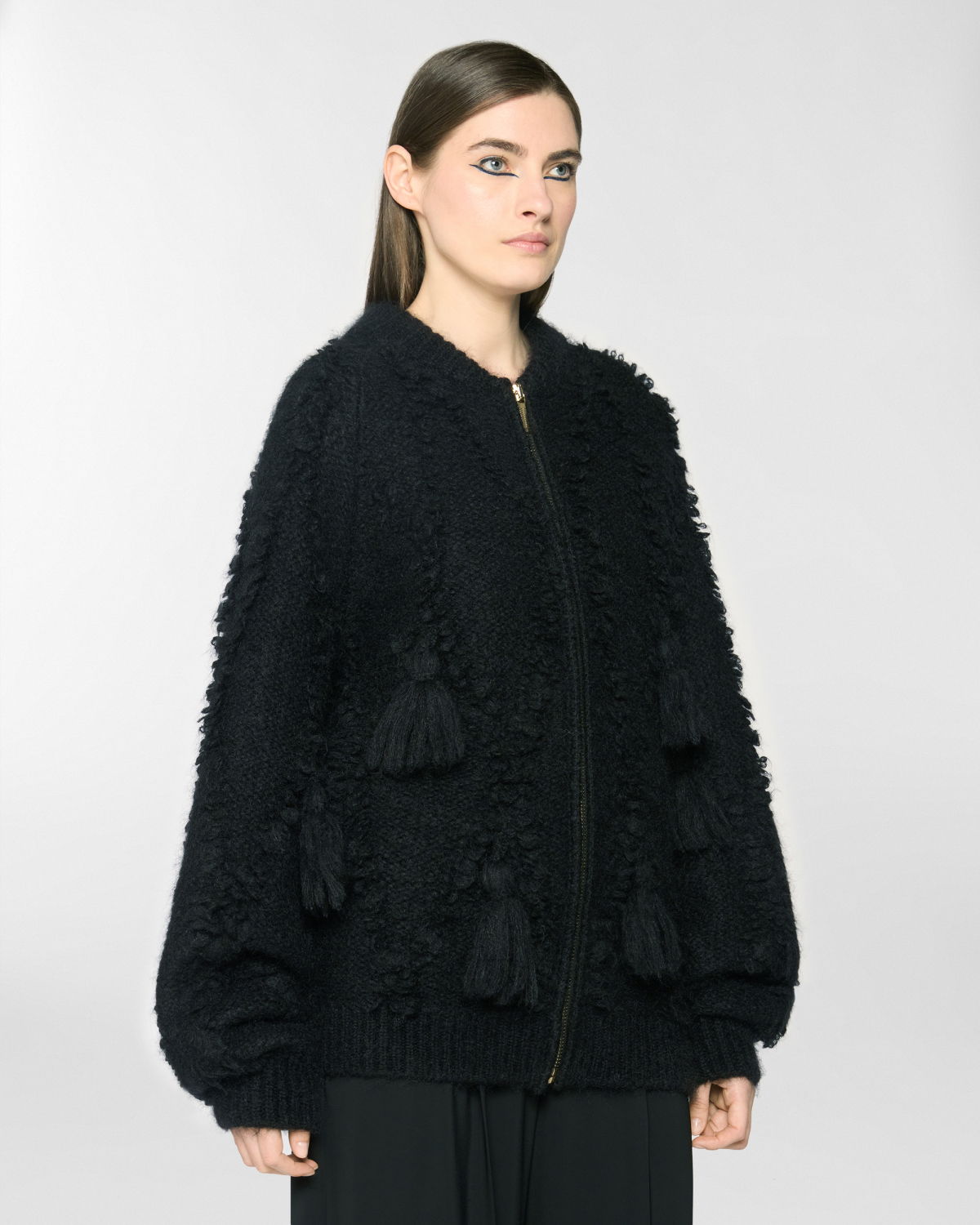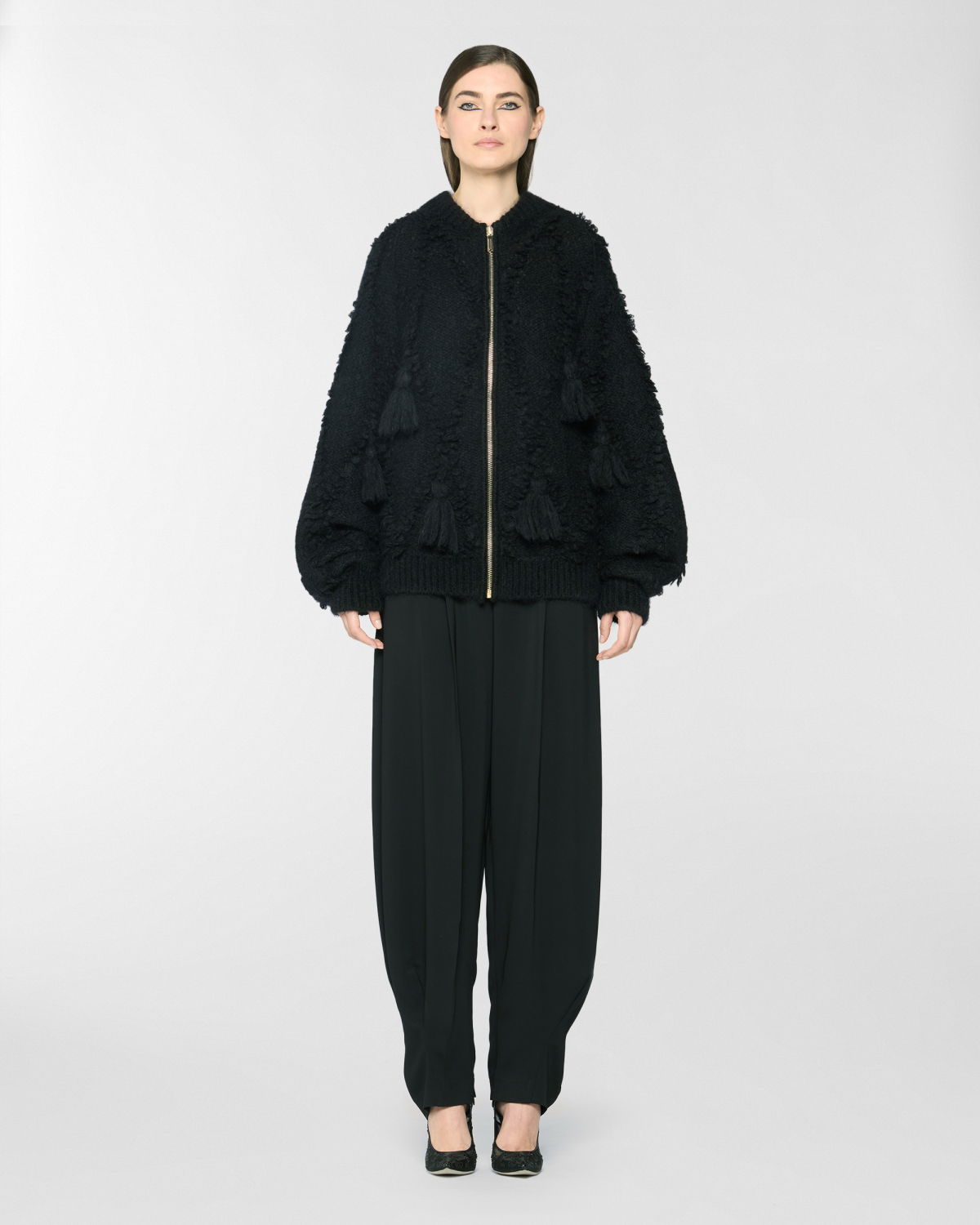 Oversized bomber jacket crafted from fine mohair jacquard, featuring raglan sleeves and a three-dimensional texture. The raised workmanship elegantly reinterprets the Maison’s iconic tassel motif, hand-applied for a refined artisanal touch. A garment that blends softness, sophistication, and contemporary flair.