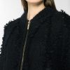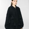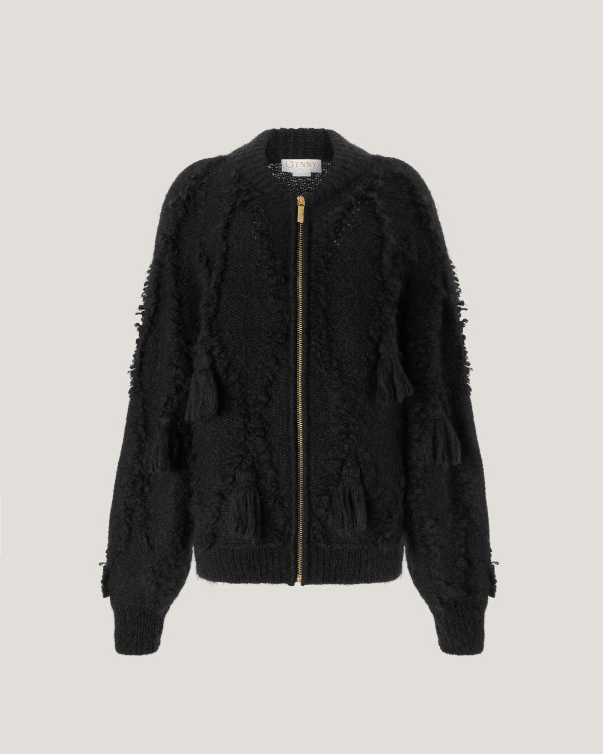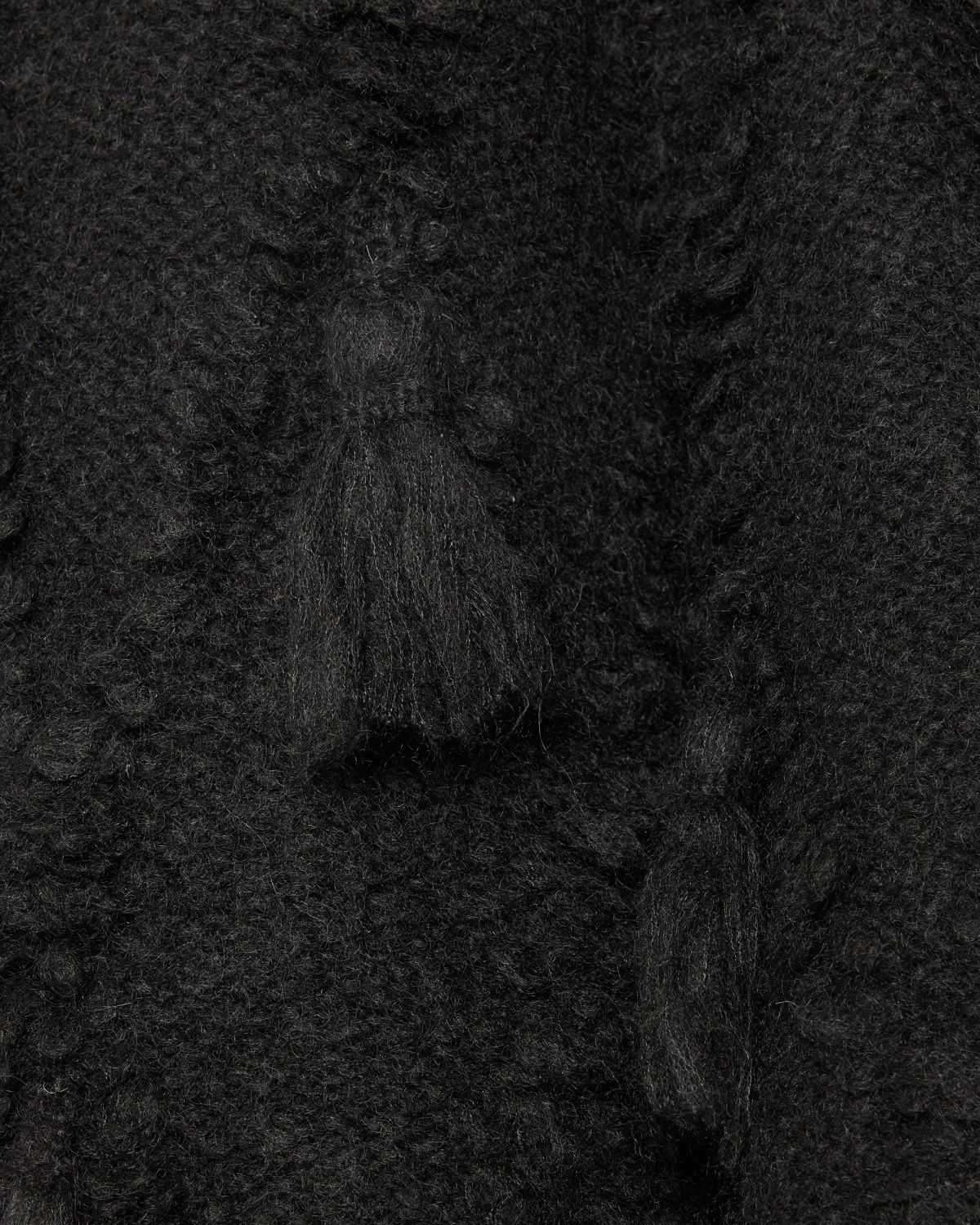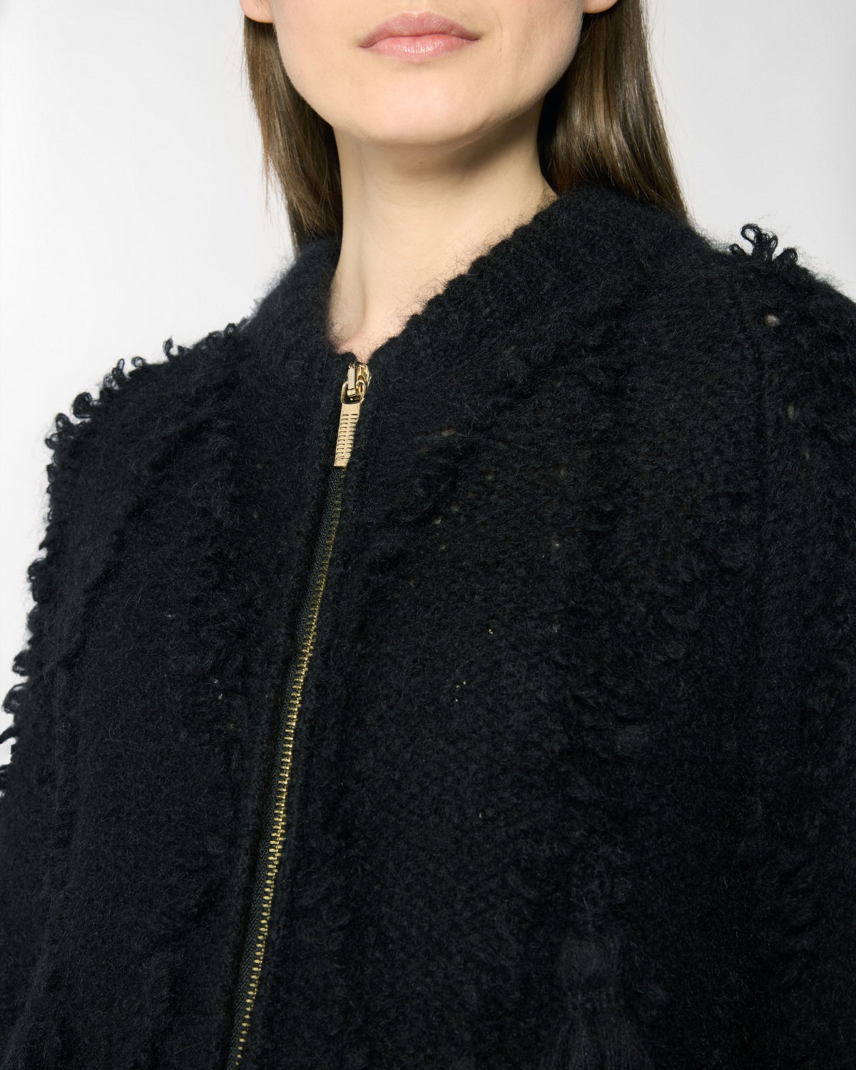 Oversized bomber jacket crafted from fine mohair jacquard, featuring raglan sleeves and a three-dimensional texture. The raised workmanship elegantly reinterprets the Maison’s iconic tassel motif, hand-applied for a refined artisanal touch. A garment that blends softness, sophistication, and contemporary flair.