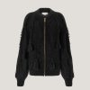 Oversized bomber jacket crafted from fine mohair jacquard, featuring raglan sleeves and a three-dimensional texture. The raised workmanship elegantly reinterprets the Maison’s iconic tassel motif, hand-applied for a refined artisanal touch. A garment that blends softness, sophistication, and contemporary flair.