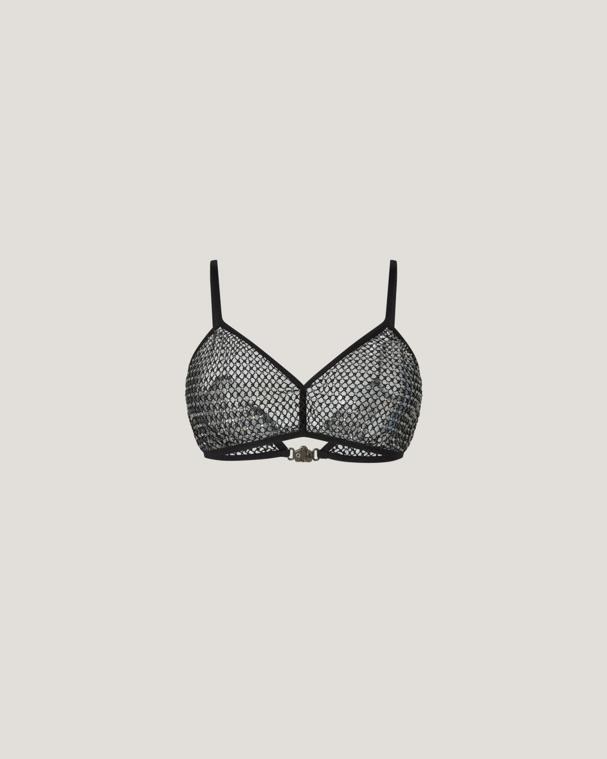 This bralette top is crafted from stretch mesh and enriched with all-over rhinestone and pearl embroidery, offering luminous allure and charm. The essential silhouette is elevated by a signature three-dimensional plaque closure, evoking the Maison iconic orchid. Ideal worn under a sophisticated blazer or as the statement piece of a bold yet refined evening look.