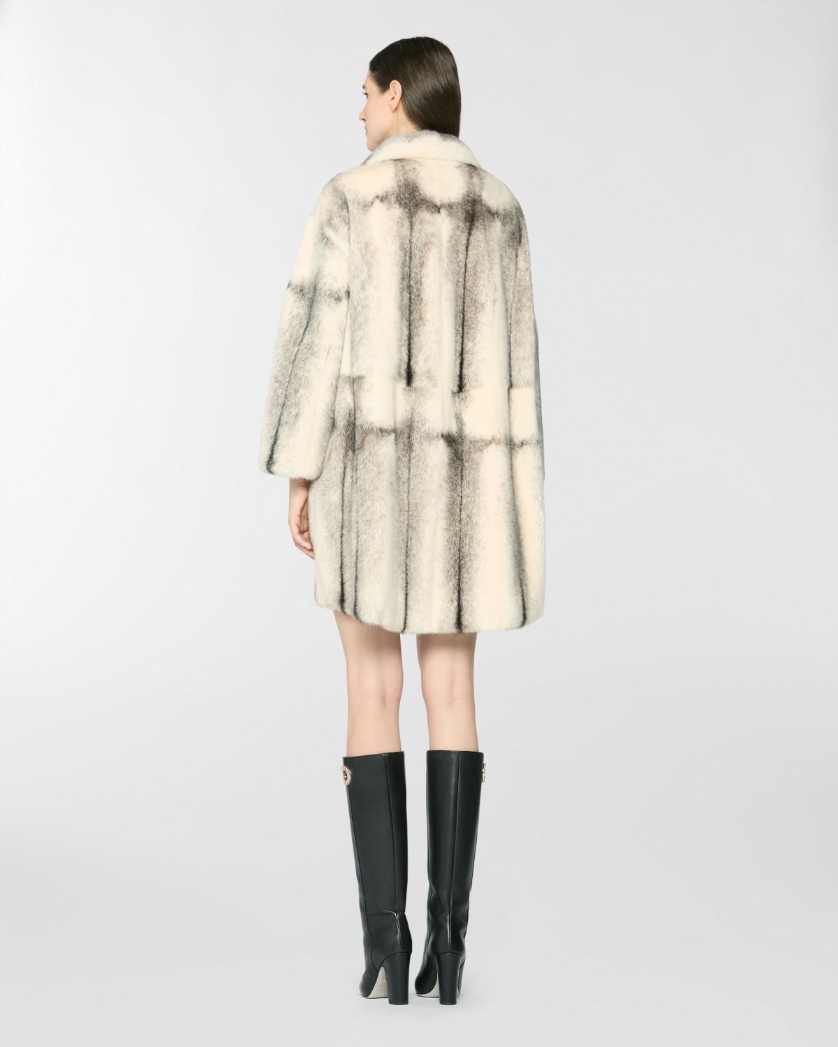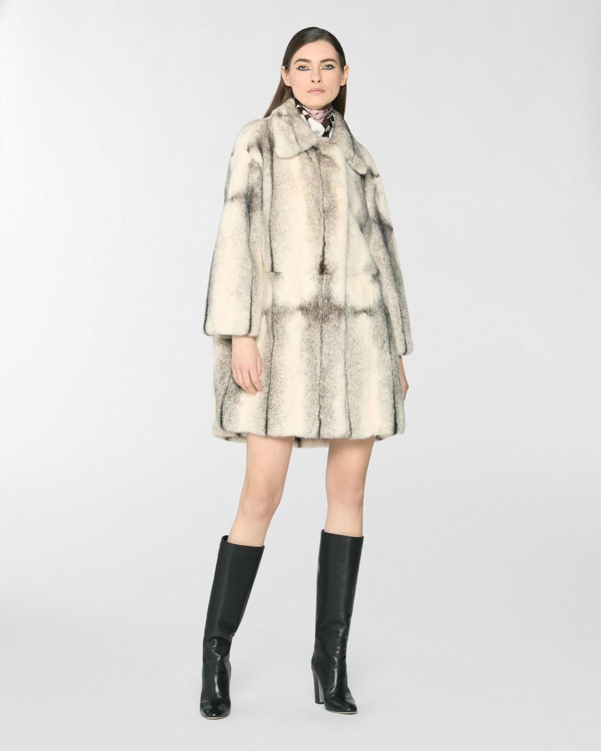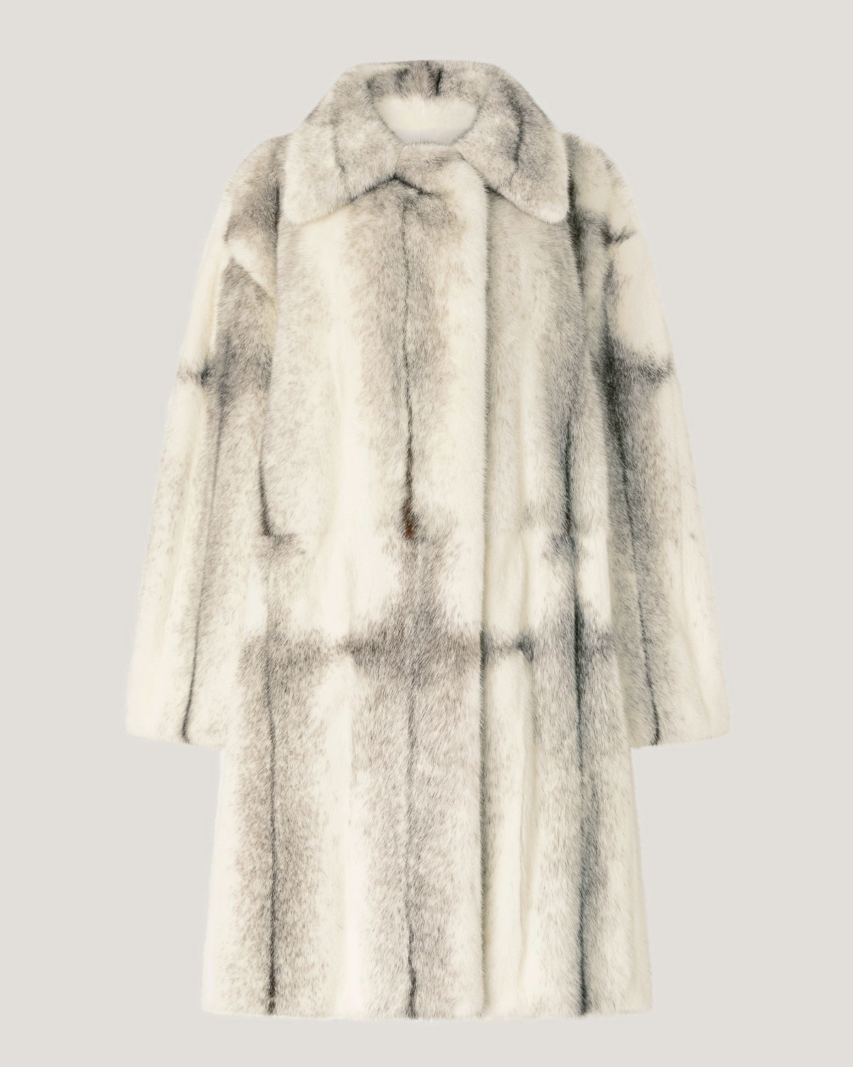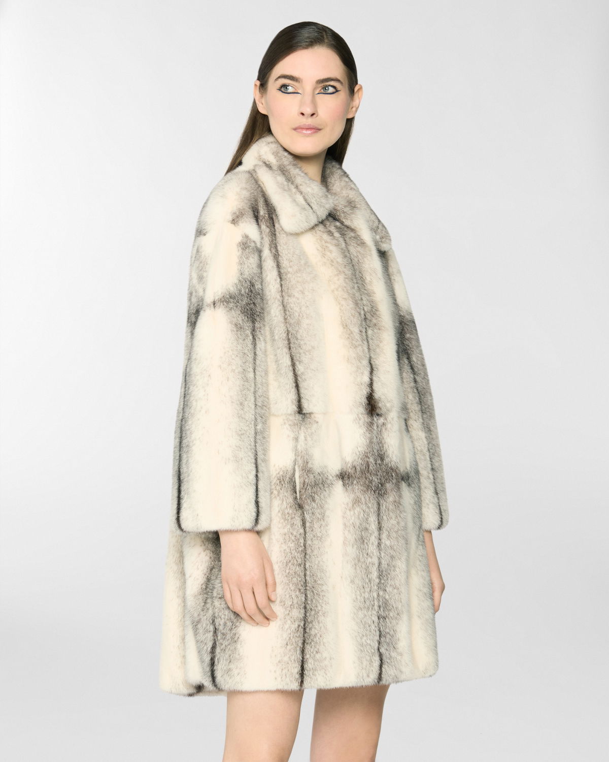 Coat crafted from fine mink fur, featuring a soft, slightly flared silhouette with long sleeves. The classic collar and concealed single-breasted closure lend an elegant aesthetic, while vertical welt pockets at the sides complete the design. A timeless piece designed to grace the coldest days with refined warmth.