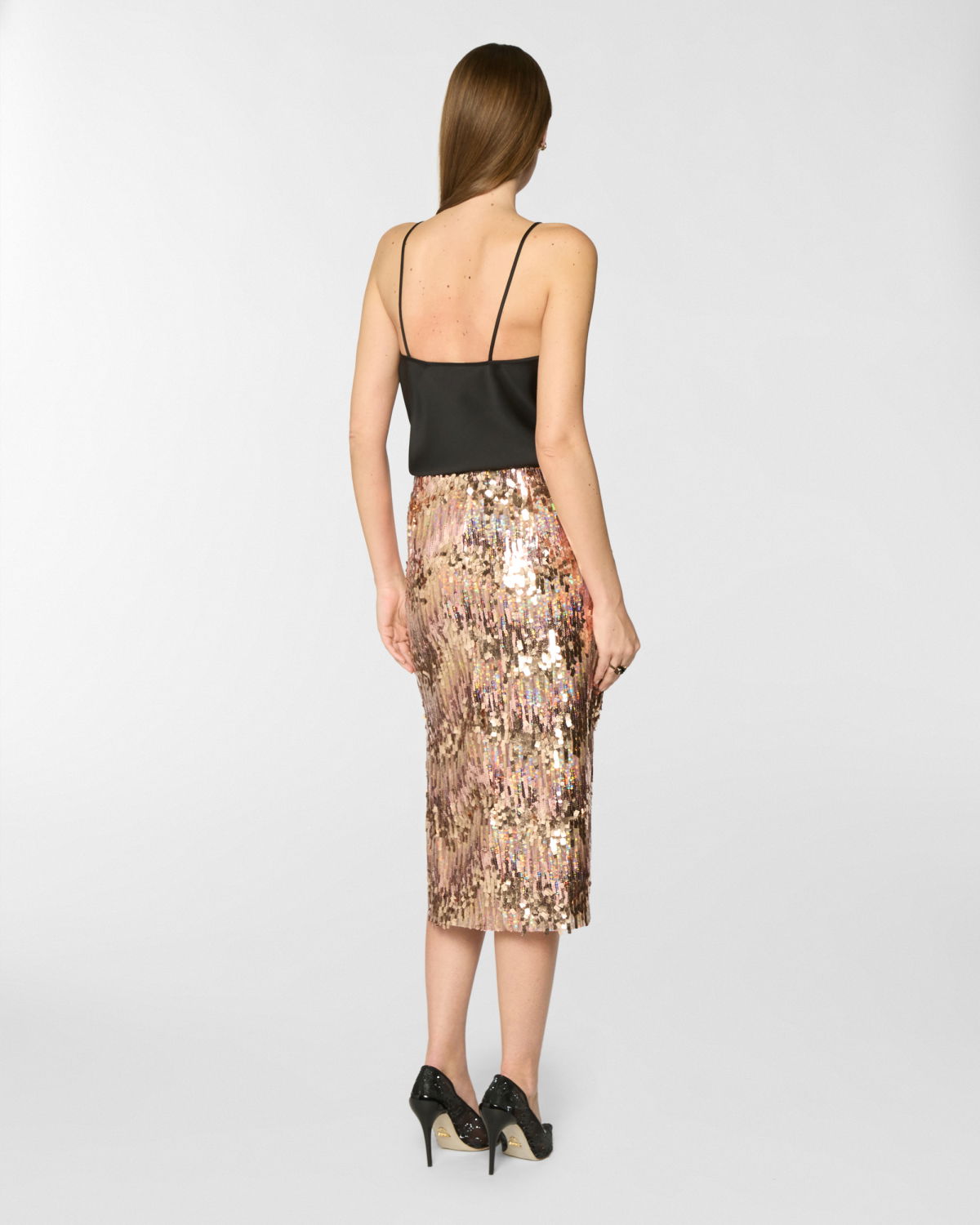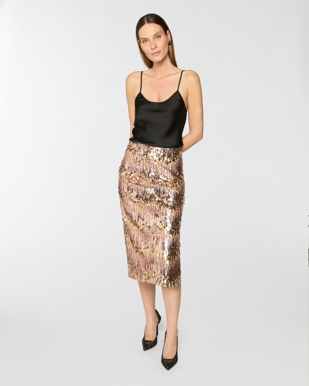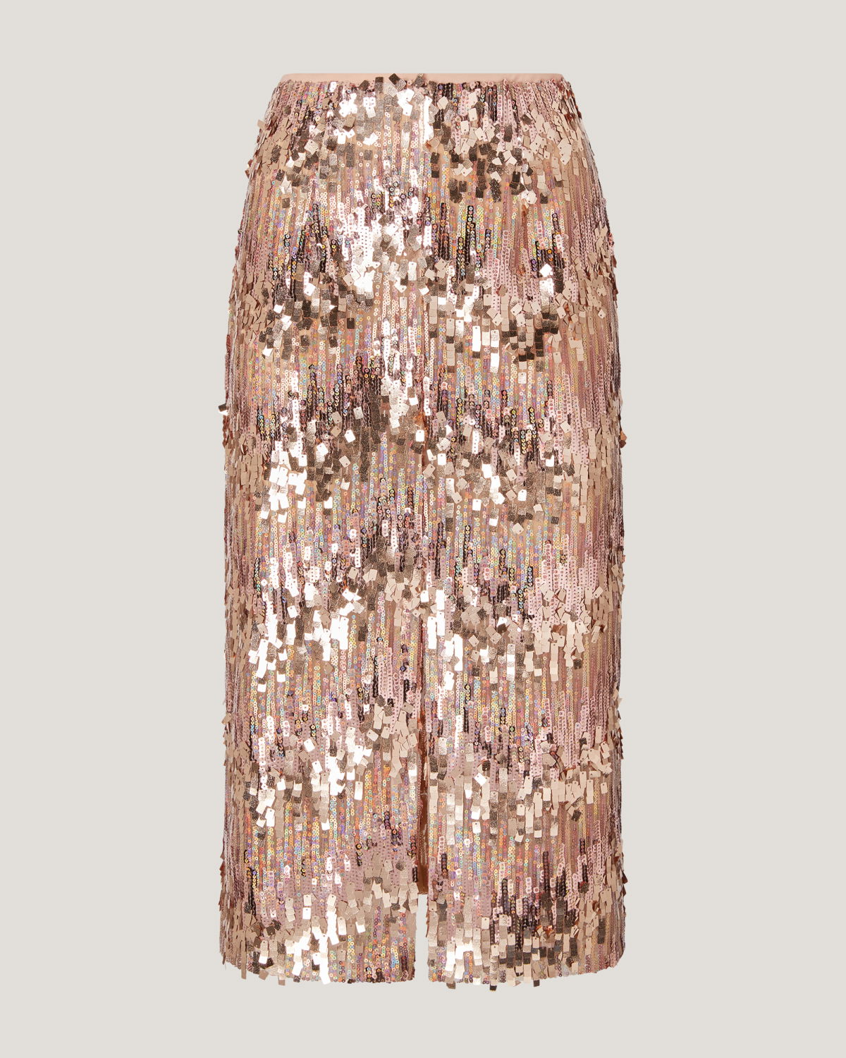 This pencil skirt is embellished with iridescent geometric sequin embroidery that creates a refined play of light. The knee-length cut and body-hugging fit enhance the silhouette, while the slit adds a sensual, dynamic touch.