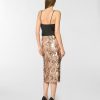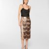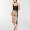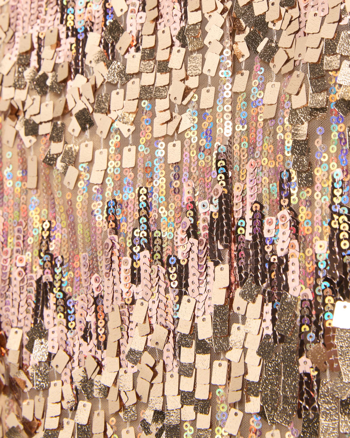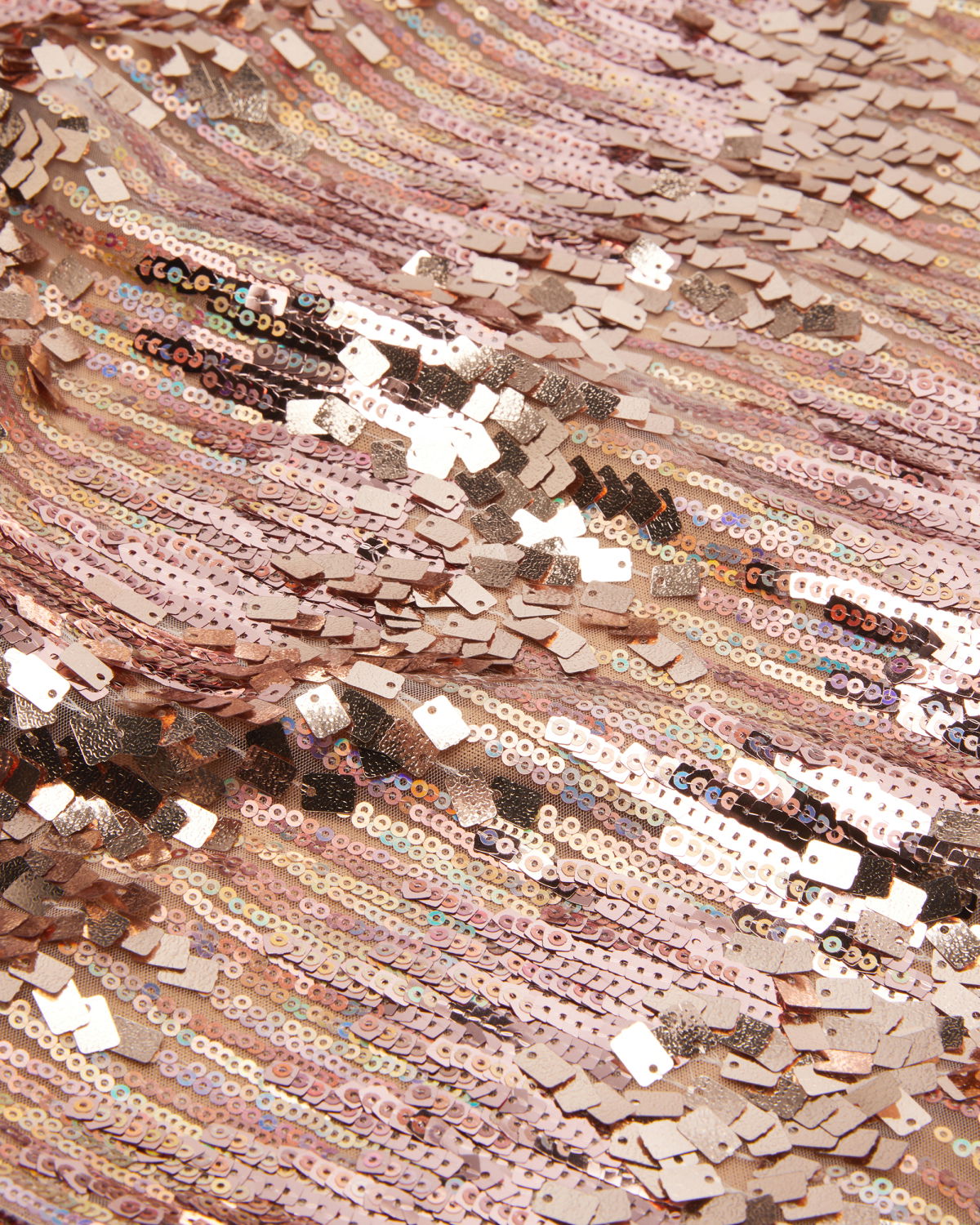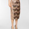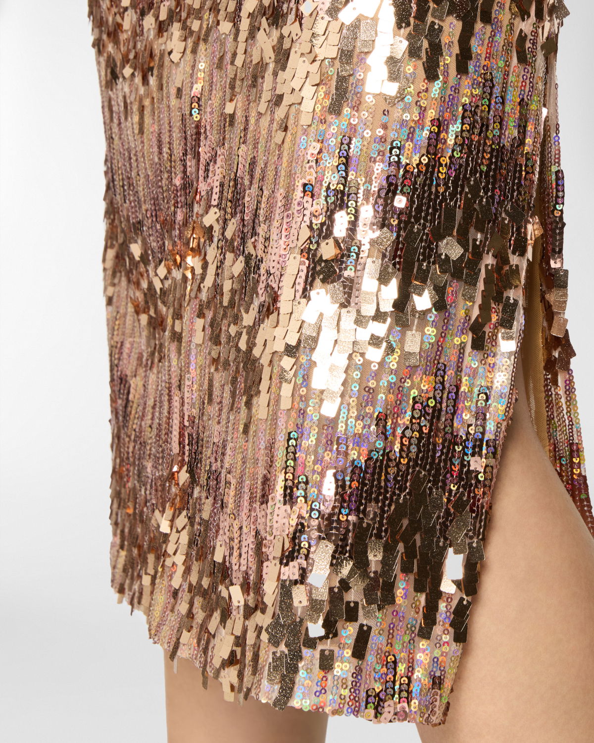 This pencil skirt is embellished with iridescent geometric sequin embroidery that creates a refined play of light. The knee-length cut and body-hugging fit enhance the silhouette, while the slit adds a sensual, dynamic touch.