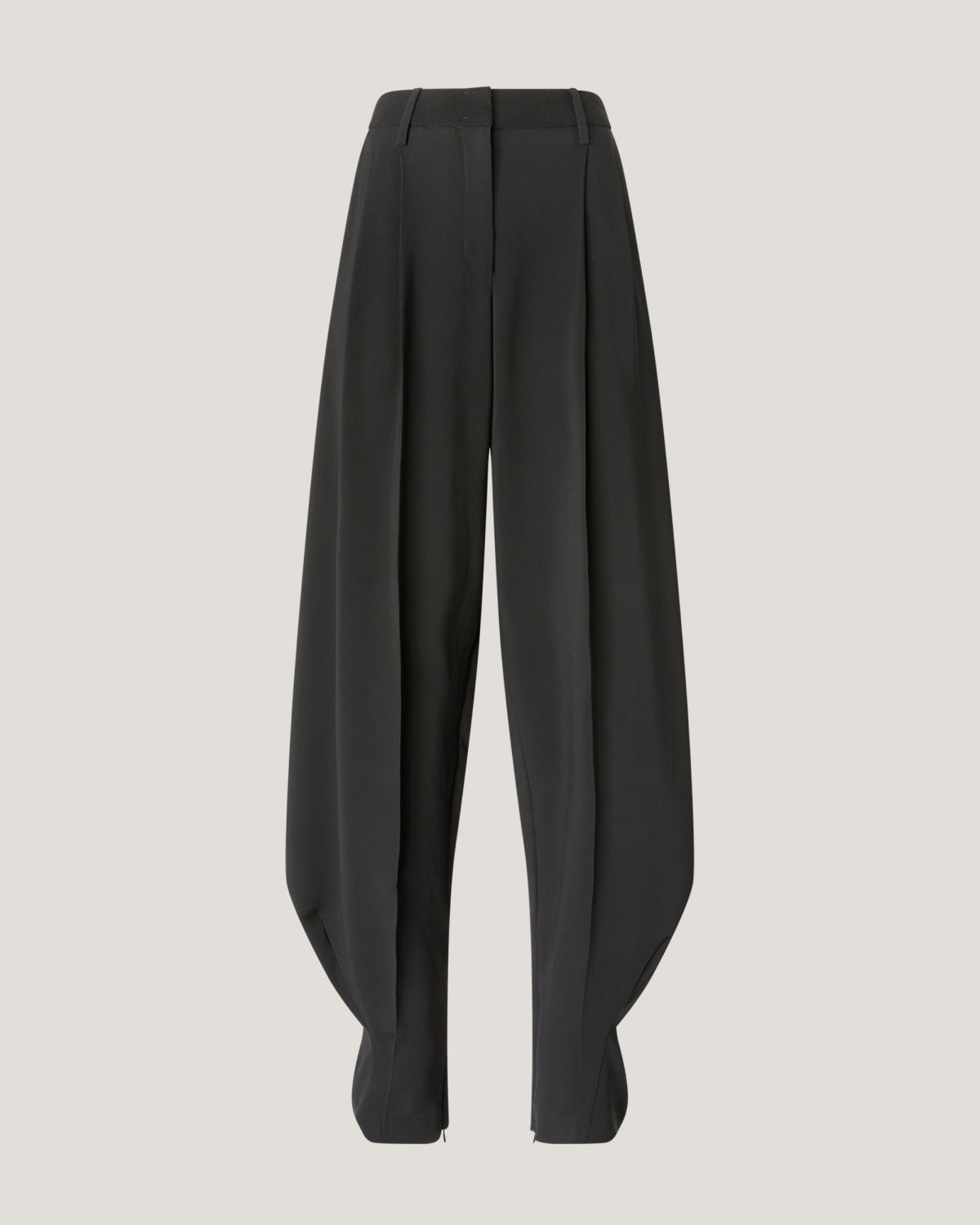 Long pants with a fluid, soft silhouette, enhanced by front pleats that add volume and graceful movement. High-waisted with a structured waistband, French pockets at the sides, and a single welt pocket at the back. Crafted from a viscose-blend cady with a subtly lustrous texture.