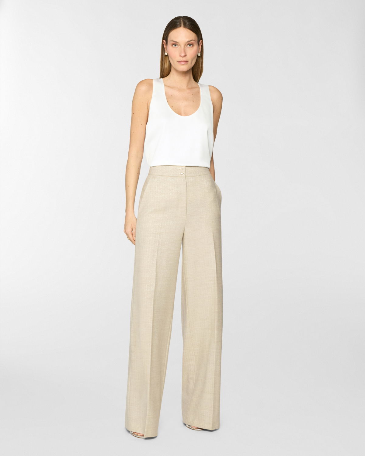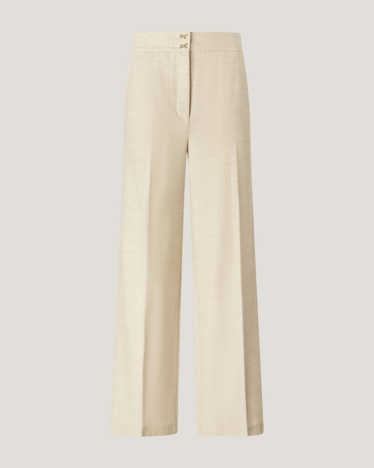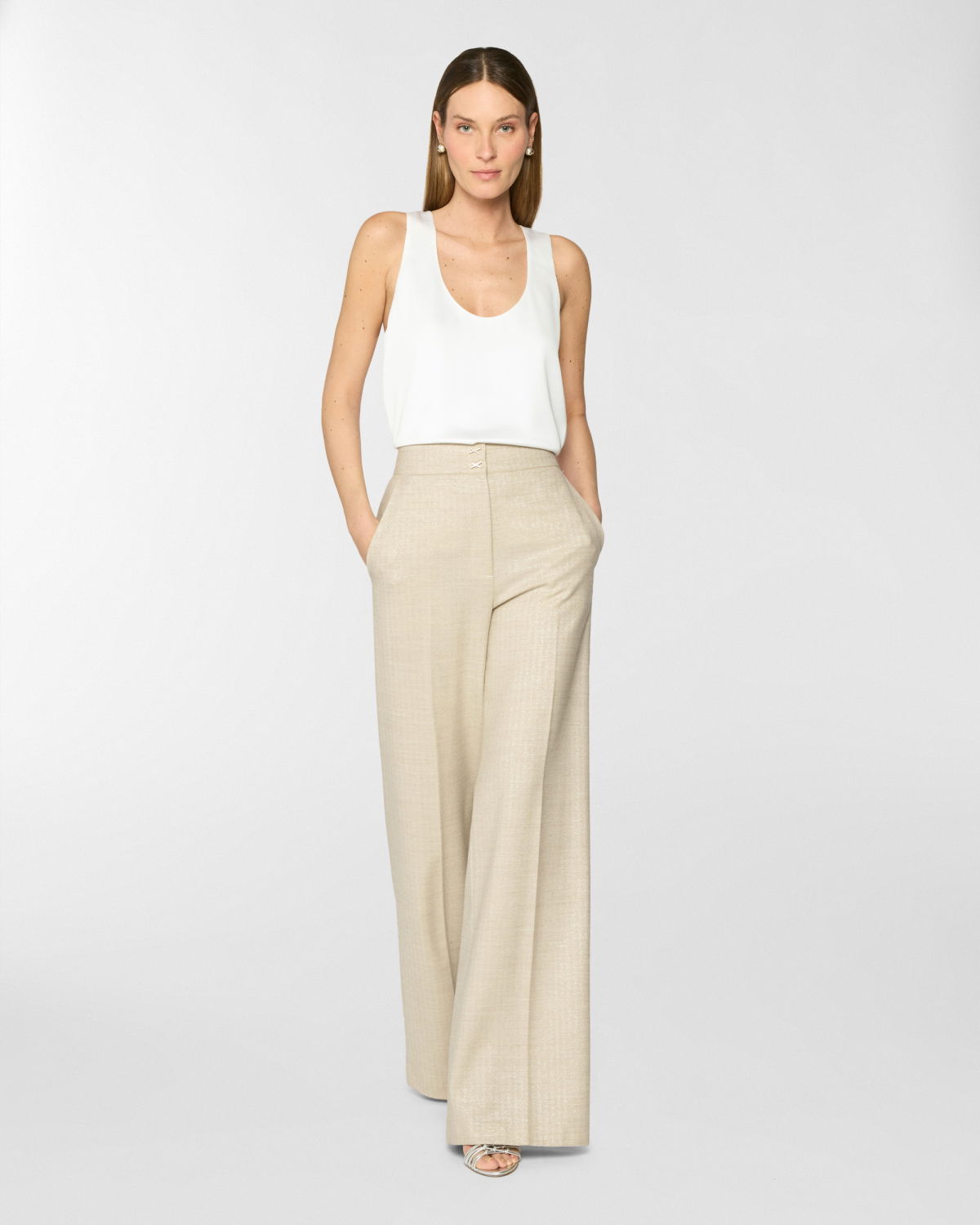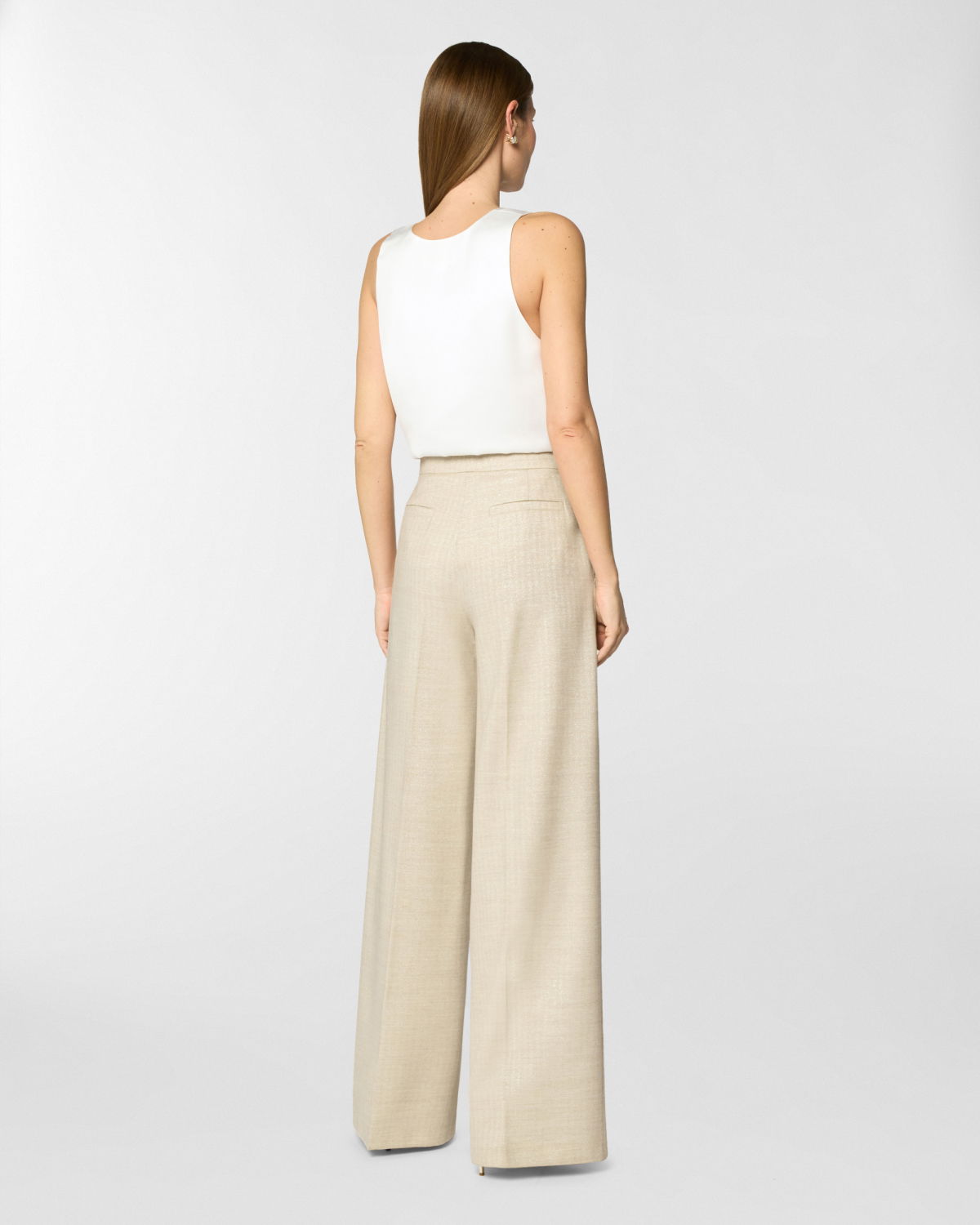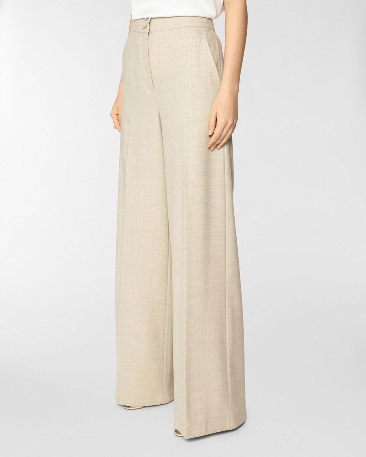 These tailored palazzo pants are crafted from flannel. Their signature features are volume and fluidity, enhanced by a pressed crease. The mid-rise waist and French pockets contribute to a silhouette that is both graceful and refined. The hidden hook-and-eye closure is finished with two iconic “X”-shaped plaques, signature accessories of the Maison.