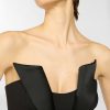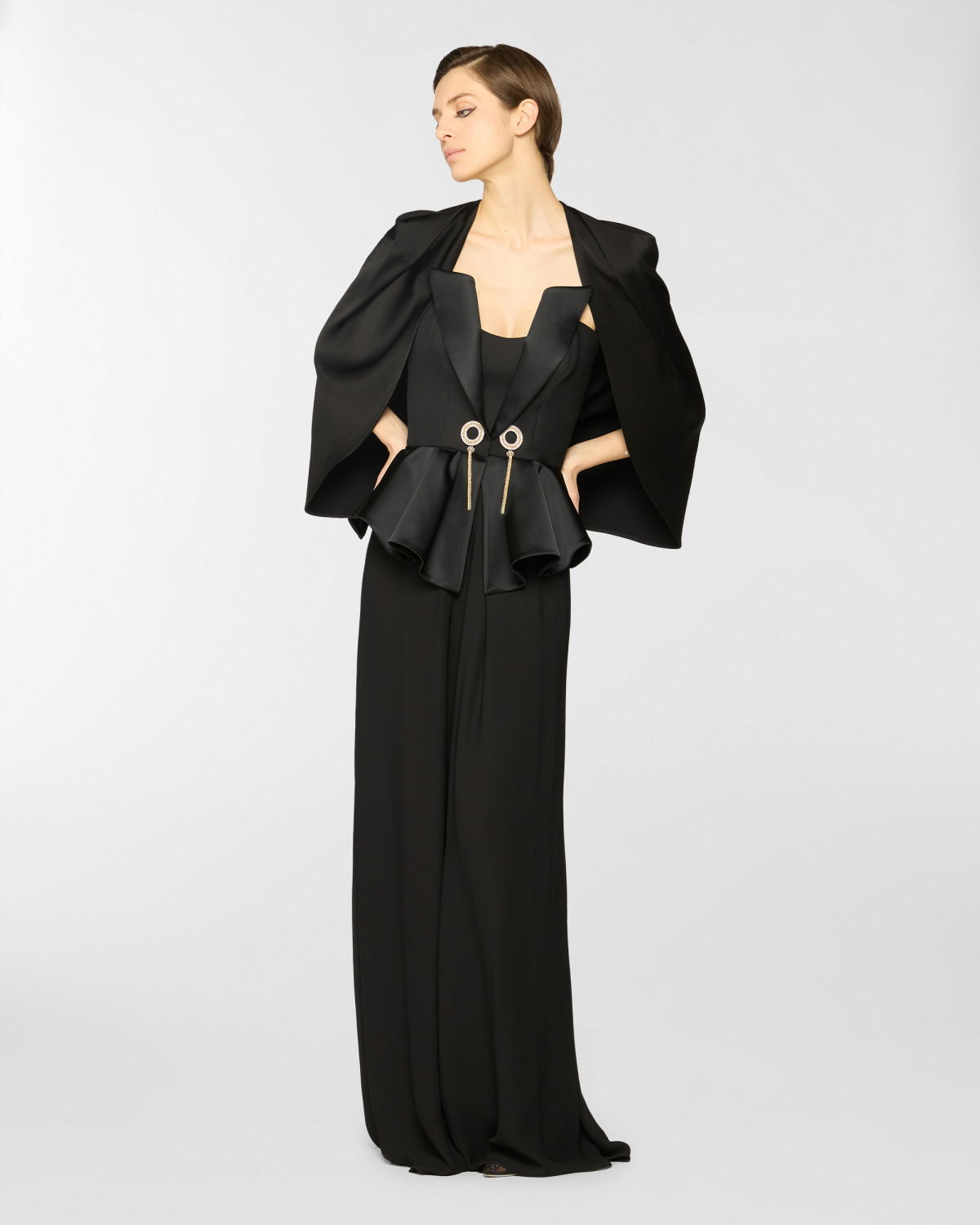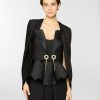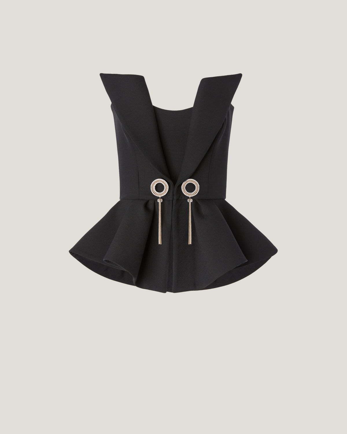 Bustier top with a geometric neckline and sculptural silhouette, enhanced by an elegant peplum that highlights the waist. The tailored design is embellished with two jewel tassels on the front—an iconic reinterpretation of the Maison’s codes. Crafted from a wool-blend fabric with a refined double-face finish.