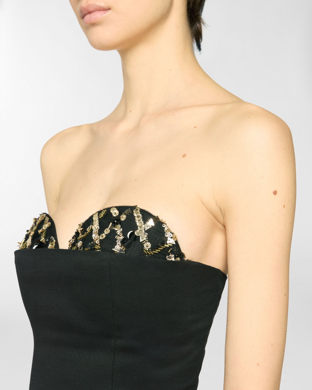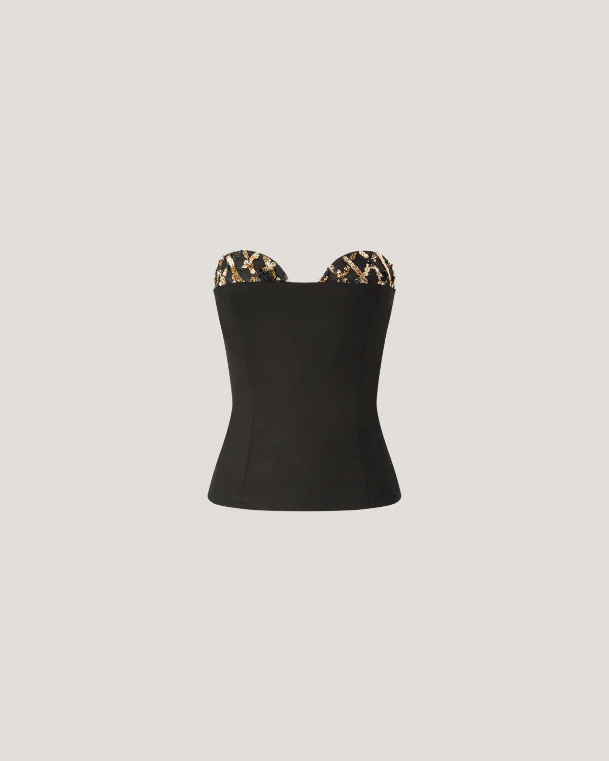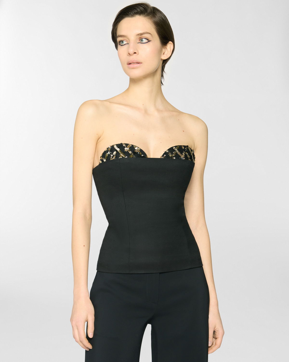 A wool-blend top with a minimalist design, embellished with jewel embroidery along the décolleté. The fitted silhouette enhances the figure, while its hip-length cut makes it both versatile and refined. Perfect for sophisticated evening looks.