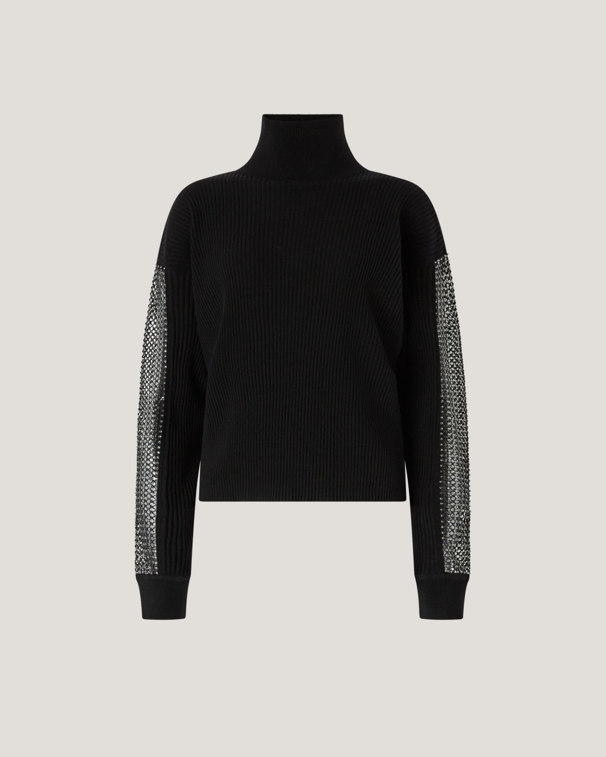 Long-sleeved ribbed wool turtleneck sweater with a relaxed fit and hip length. The sleeves are embellished with mesh inserts enriched with pearl rhinestones, adding brightness and character while contrasting elegantly with the clean design of the knit. A refined piece, perfect for contemporary looks with a luminous touch.