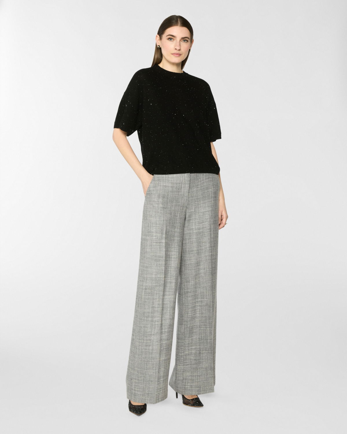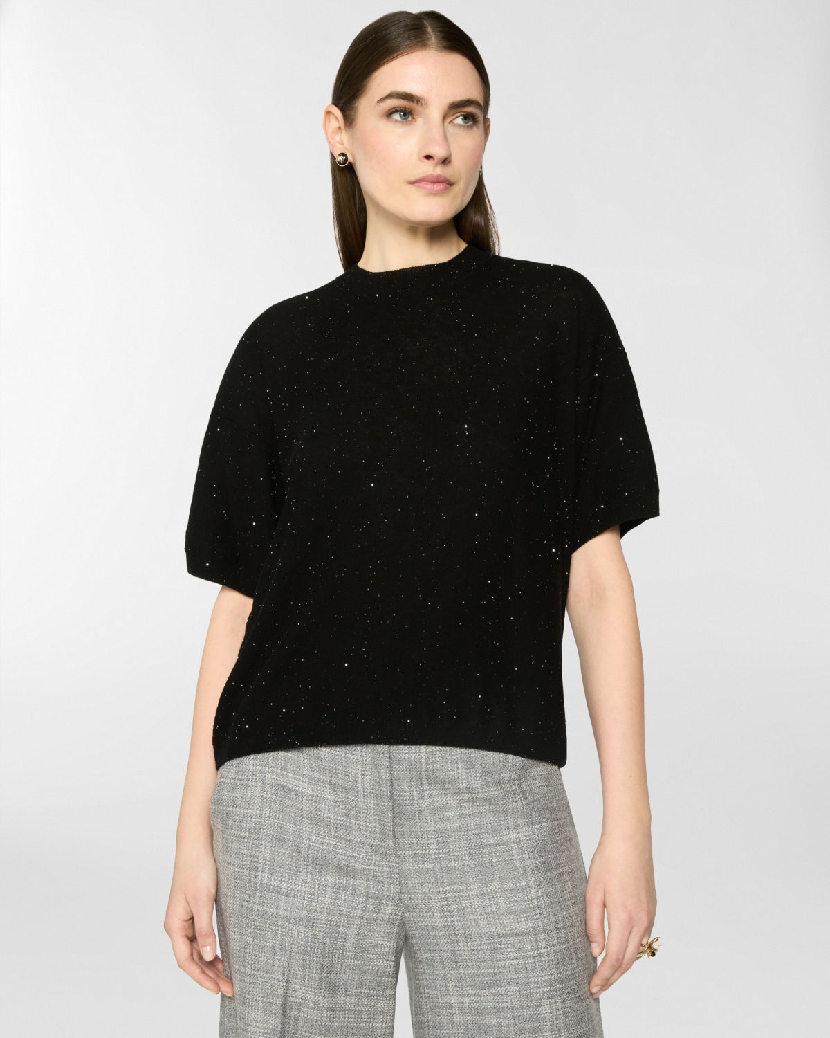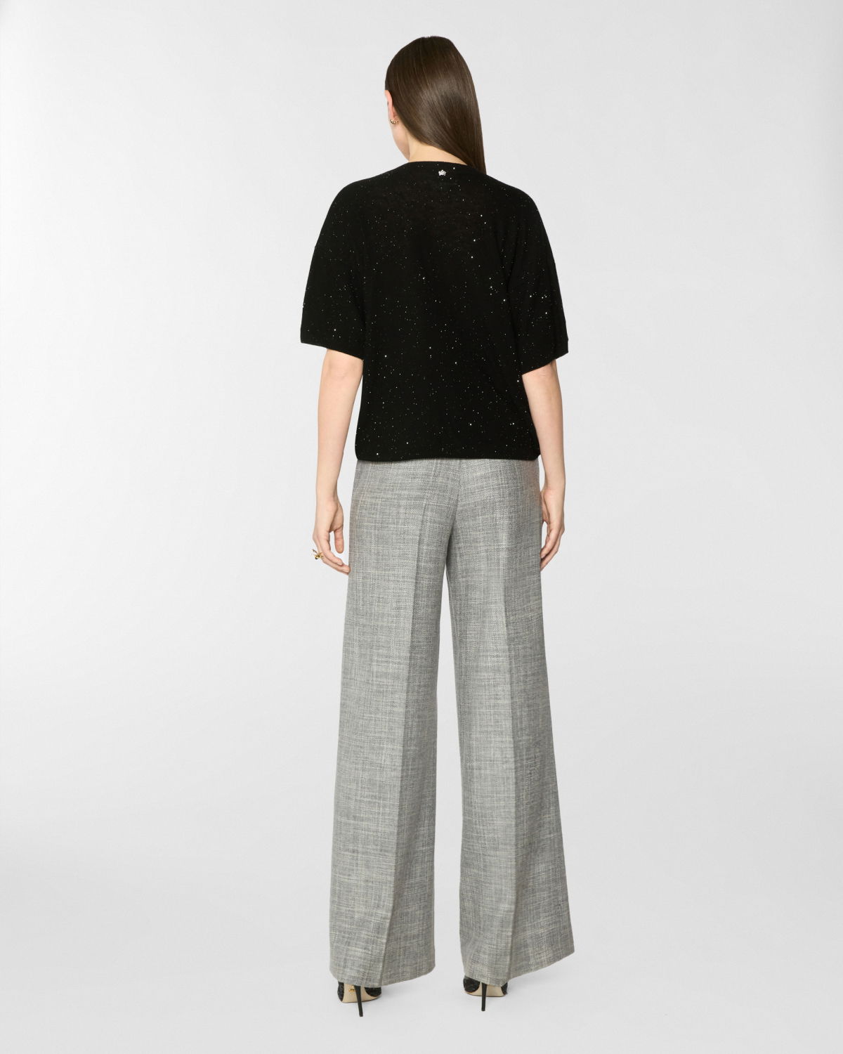 Crew-neck T-shirt in fine knit with dropped shoulders and a soft fit. The lightweight yarn embraces the silhouette with delicacy, while the micro sequins add a luminous and refined touch. The back neckline is enriched with an interlaced plaque featuring the Maison’s iconic orchid, adorned with a mini pearl.