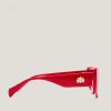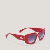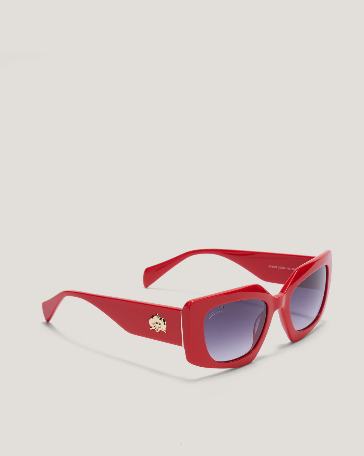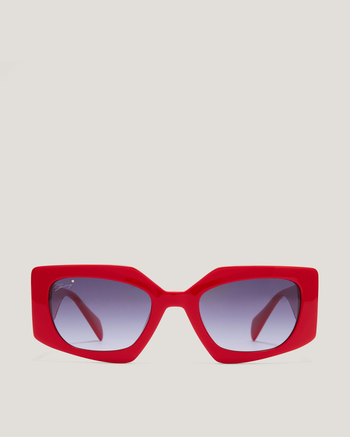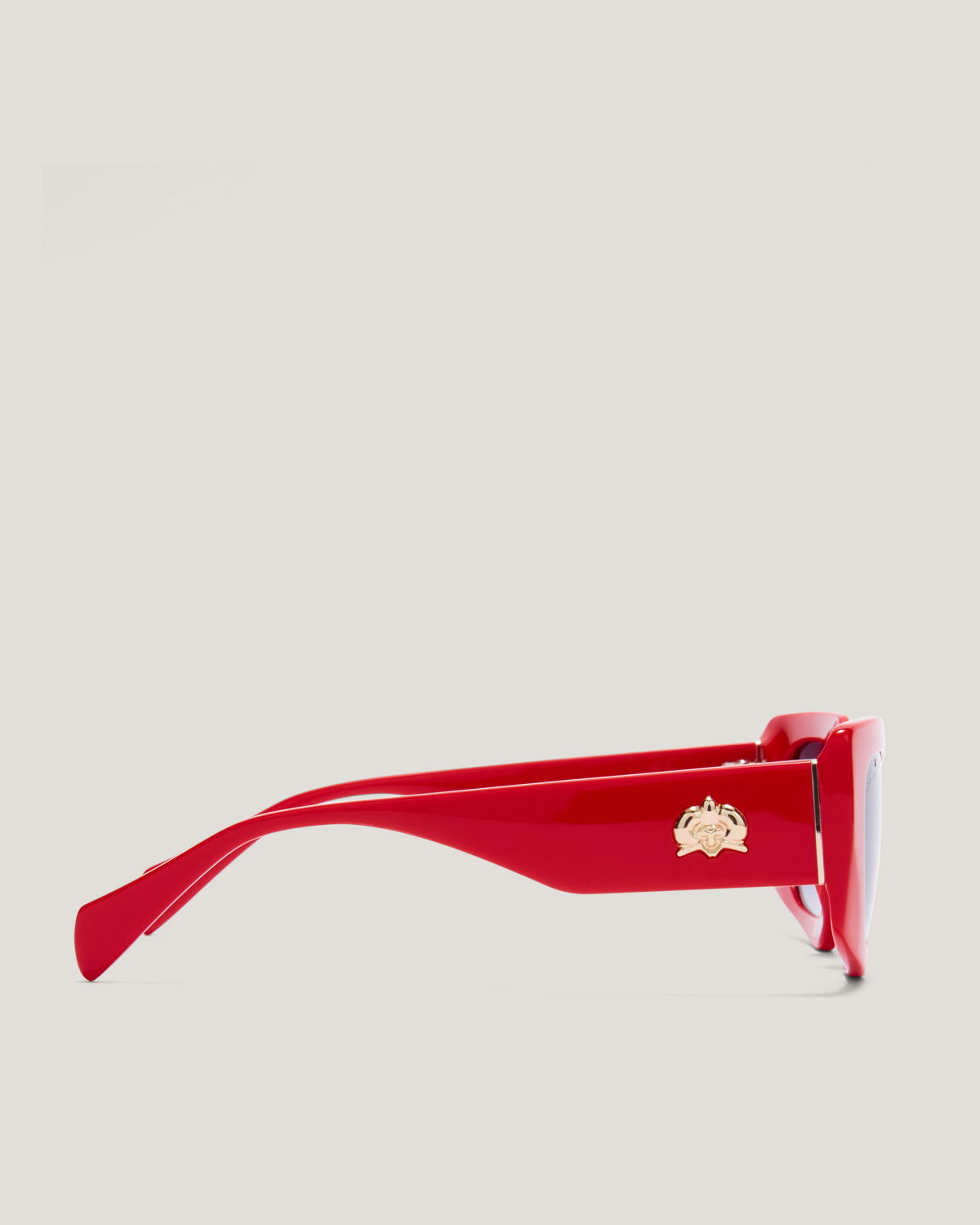 These square sunglasses, crafted with a red frame and feature gold metal details adorned with an orchid, a symbol of the Maison. They boast a modern design with sleek lines. The lilac gradient lenses add a touch of originality.