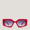 These square sunglasses, crafted with a red frame and feature gold metal details adorned with an orchid, a symbol of the Maison. They boast a modern design with sleek lines. The lilac gradient lenses add a touch of originality.