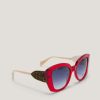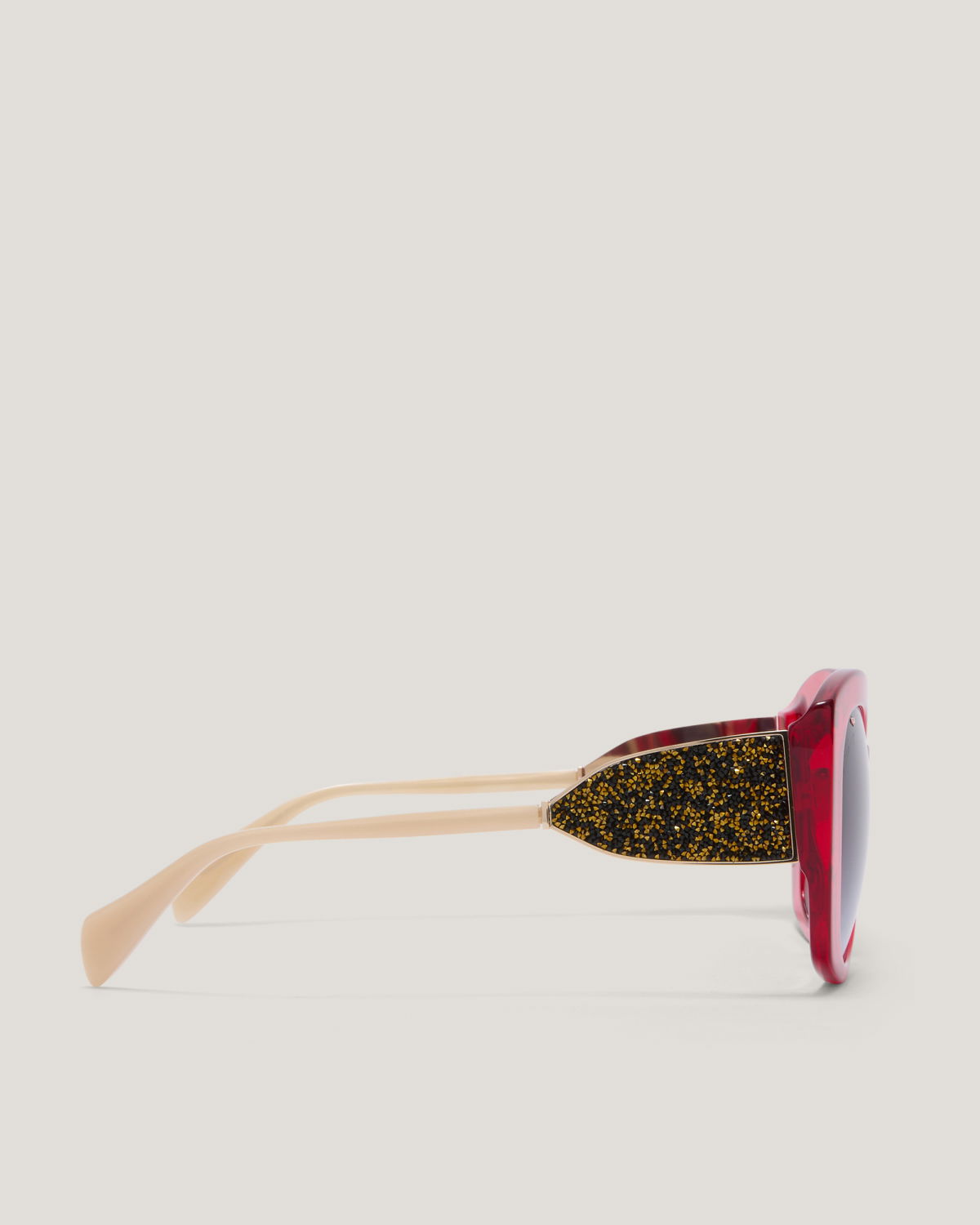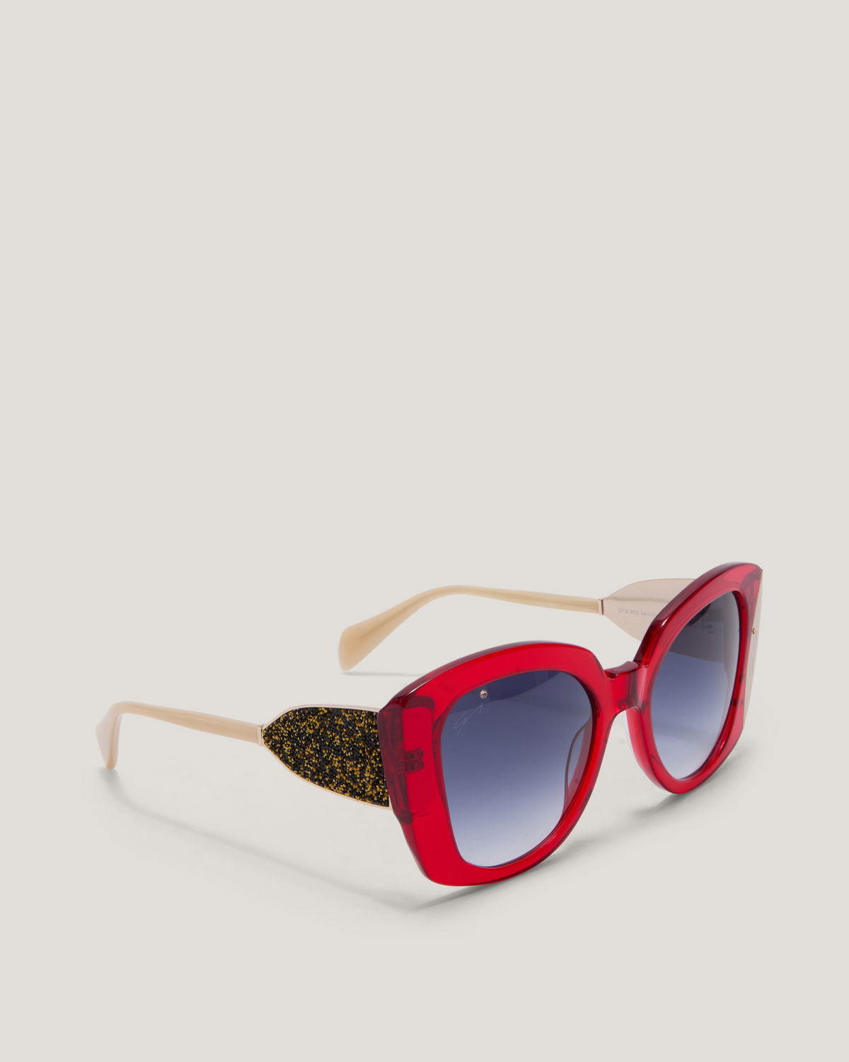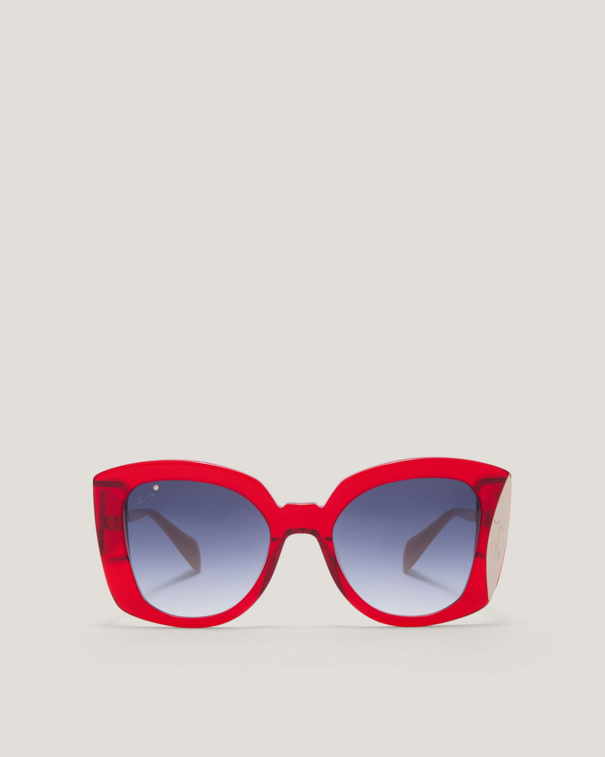 These sunglasses combine boldness and femininity with their intense red acetate frame, adding a distinctive pop of color. The side arms feature golden glitter details that lend a touch of luxury and charm, while the blue gradient lenses provide sophisticated protection against the sun’s rays. Ideal for those who love to stand out with class and personality.