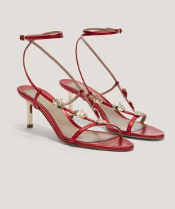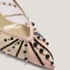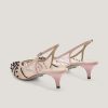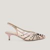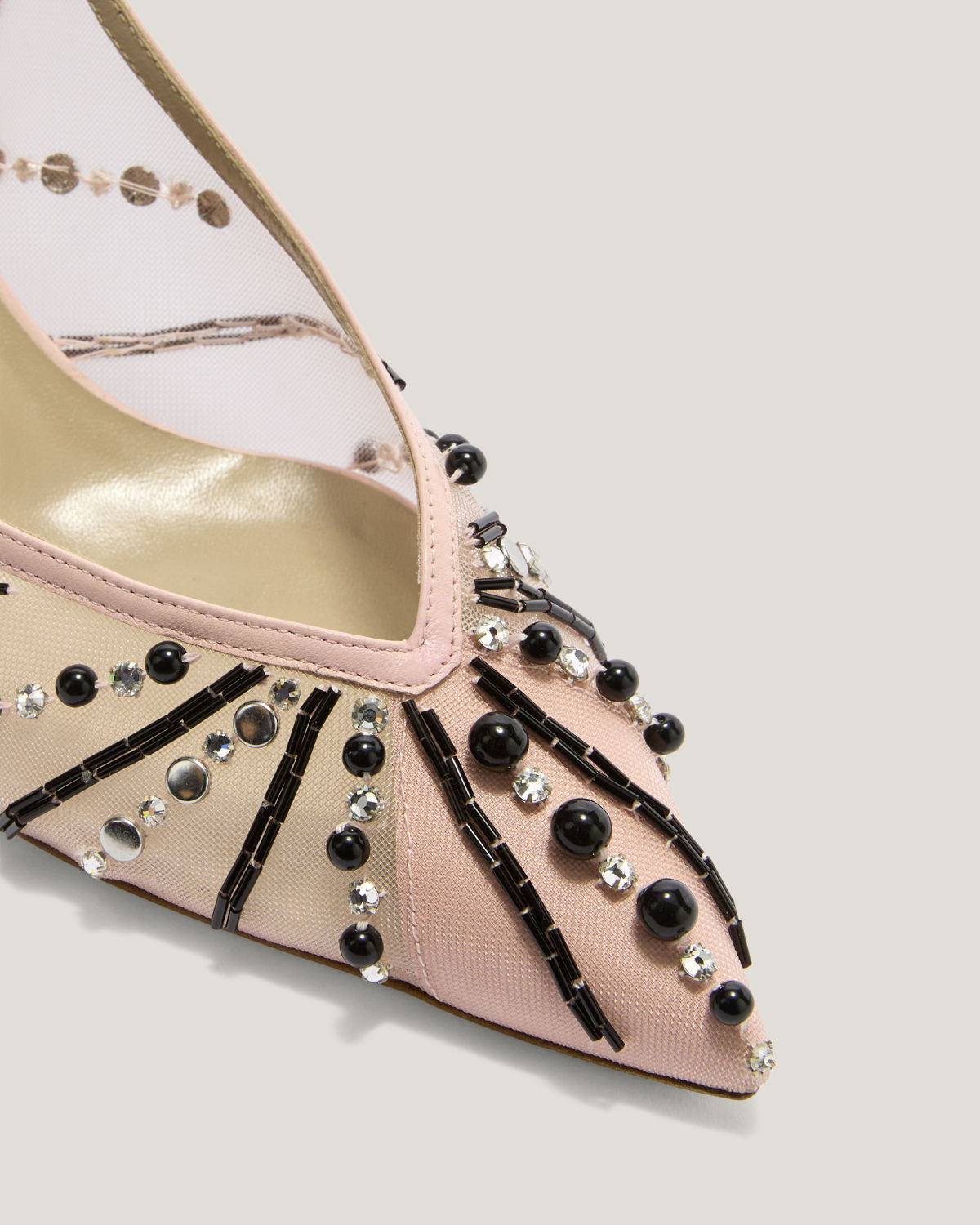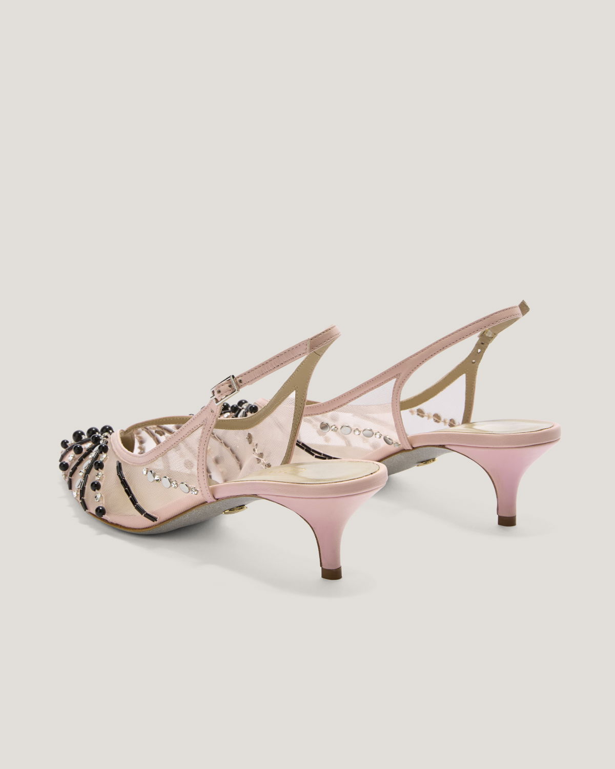 Slingback pumps with a low heel that combine elegance and modernity. Crafted in transparent mesh with leather trims, they are embellished with embroidery and luminous applications of pearls and crystals, creating a refined graphic design. The kitten heel adds comfort and versatility, making them perfect for evening looks or special occasions.