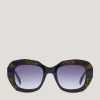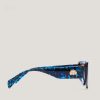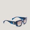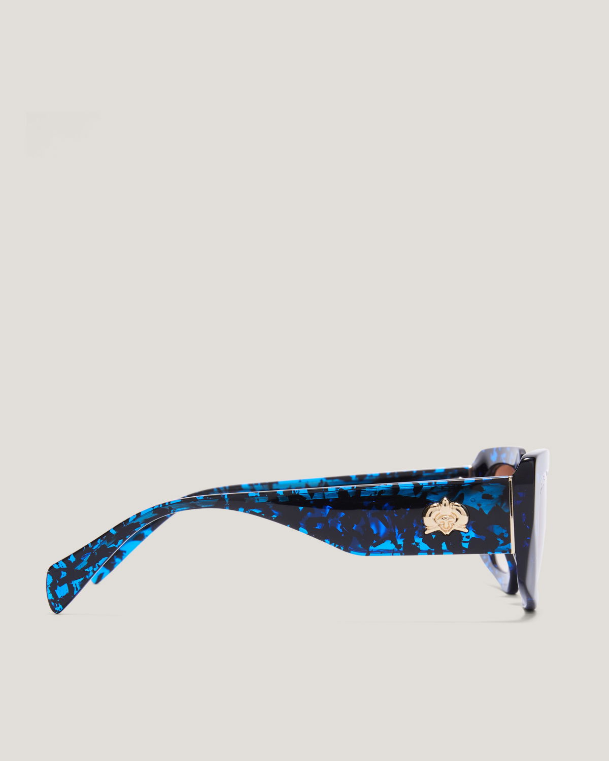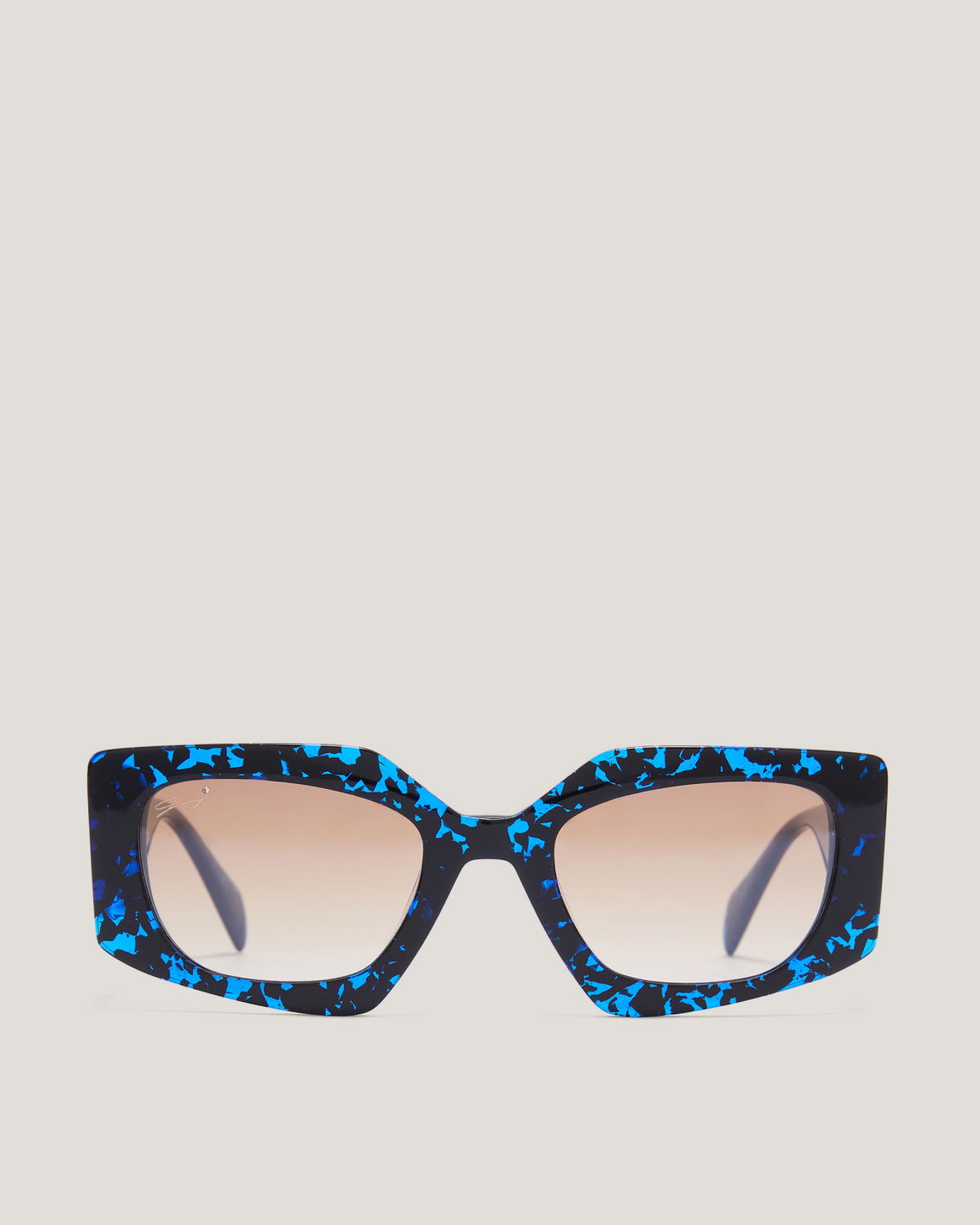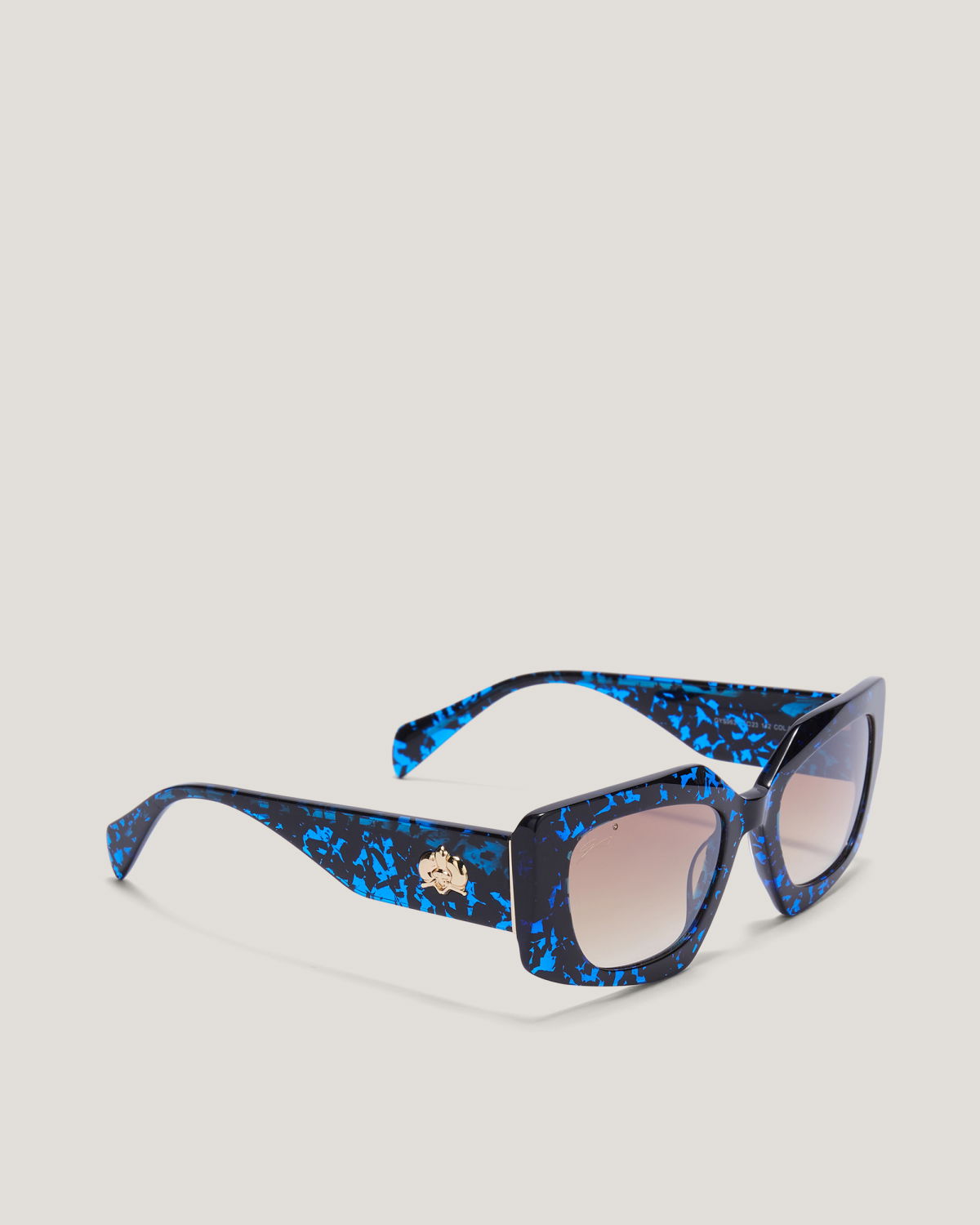 These square sunglasses, made with a black and blue tortoiseshell frame and golden metal details featuring an orchid, a symbol of the Maison. They boast a modern design with elegant lines. The gradient lenses add a touch of originality.